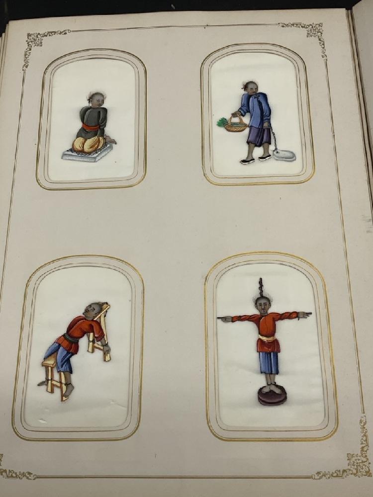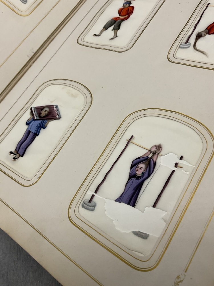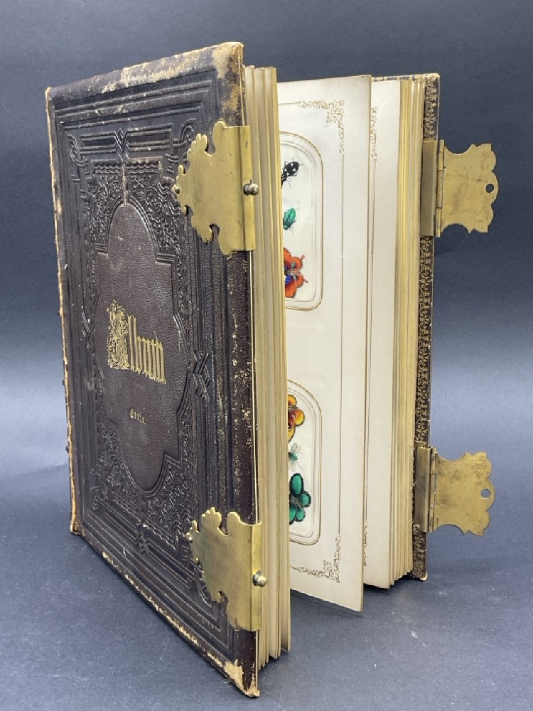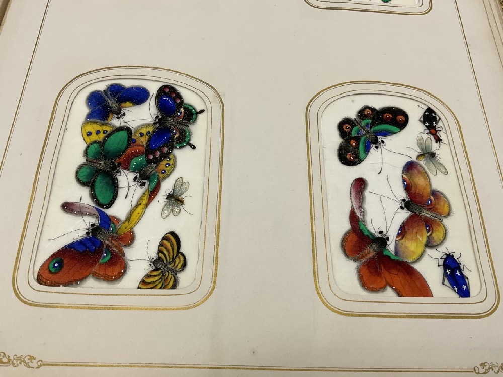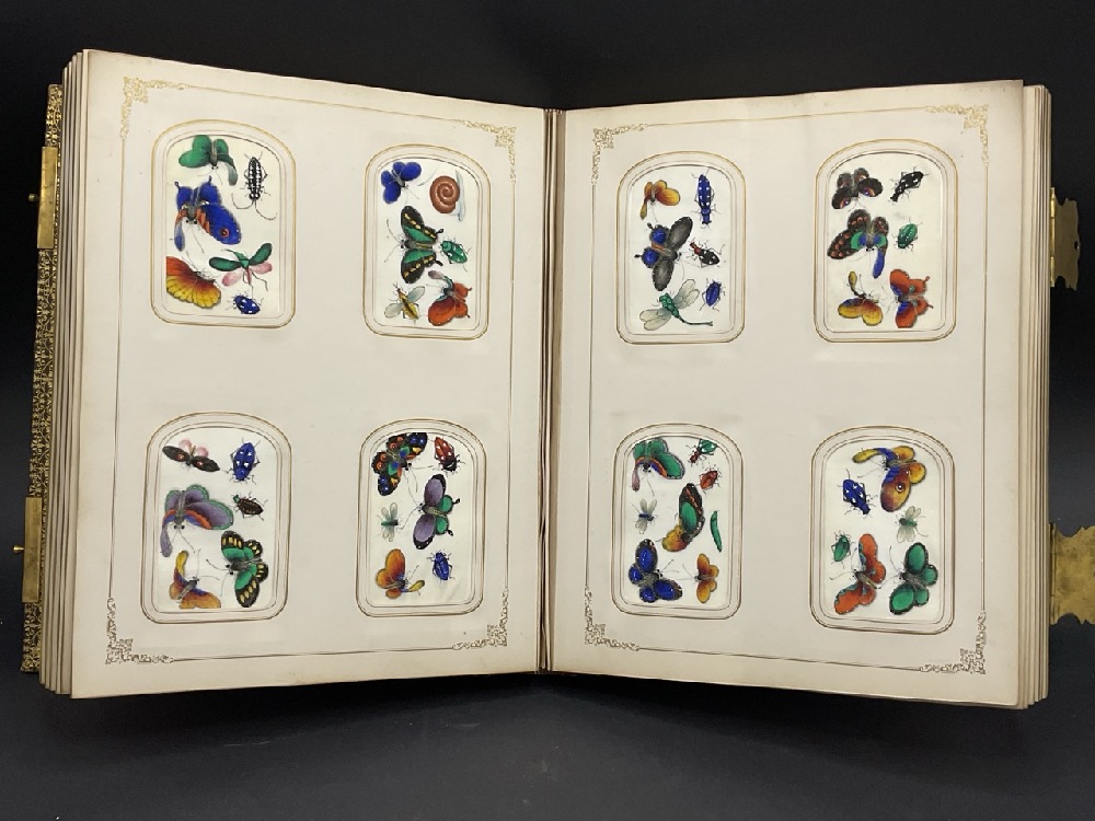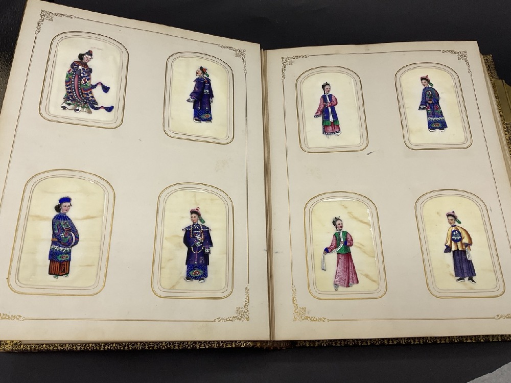 A Victorian Album filled with 120 quantity Chinese Pitch Watercolor Paintings. Including Ships, Birds, People, Torture, Bugs, Scenes and More! Some having wear but more than 90% of album is good. Please see photograph preview. This is an estate find from Prominent family heirlooms. This album remained in one family for over 100 years as collected.