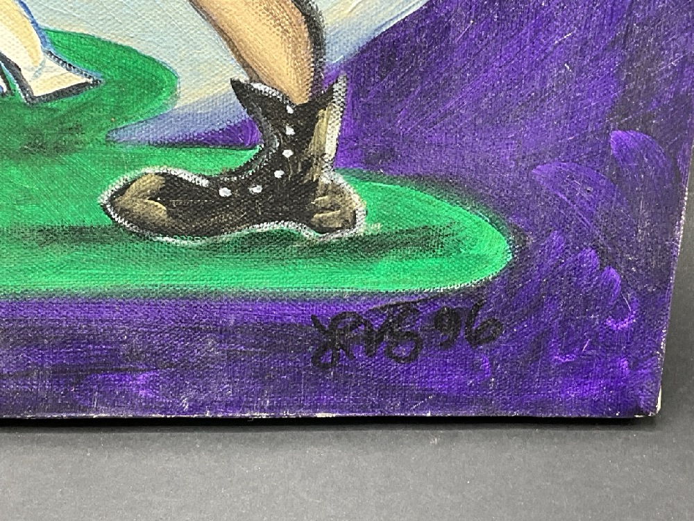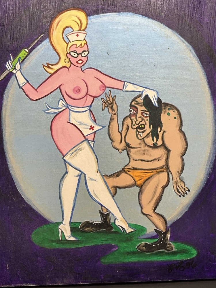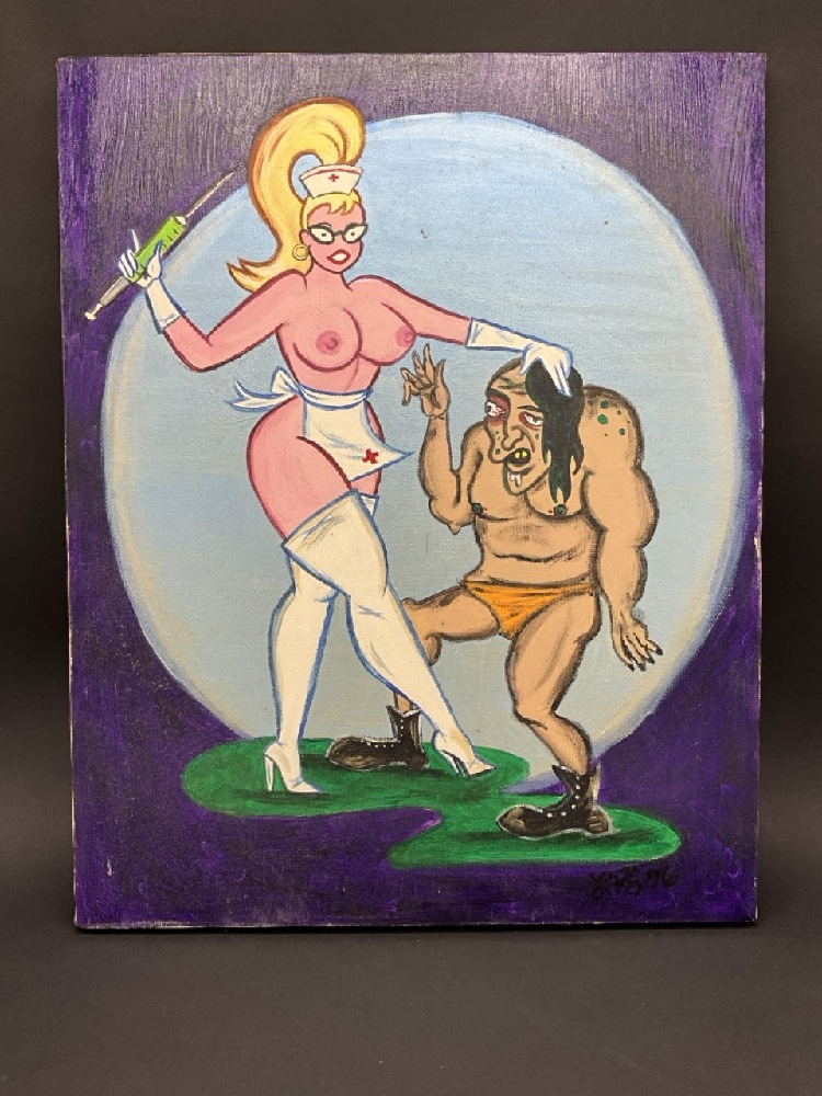 Fantasy Art, Nude Nurse and Cave Man Oil on Canvas Signed LVS 96.