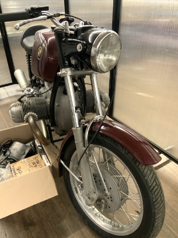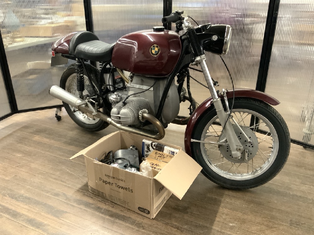 1970 BMW R75/5 Motorcycle And Parts. Bike was owned by Mr. Bell who was an active BMW racer in the 70's and 80's. His father was racing bikes in the 60's and 70's. This bike he was building for himself but never finished due to health problems. Mr. Bell passed three years ago. Engine and transmission was rebuilt to racing specifications. Tank is super clean and ready for use. Carburator was taken apart and restored but needs to be put back together. Wheels drilled for best braking performance with high quality parts, Includes a large amount of new high quality parts. All parts needed to finish project are included.