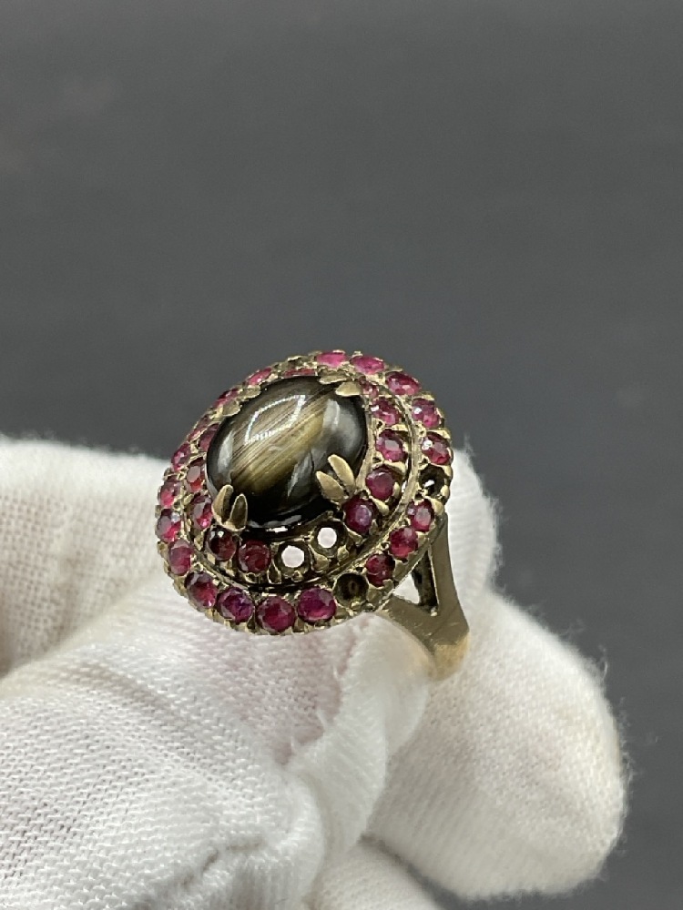 10K Yellow Gold Ruby and Cats Eye Gemstone Ring.