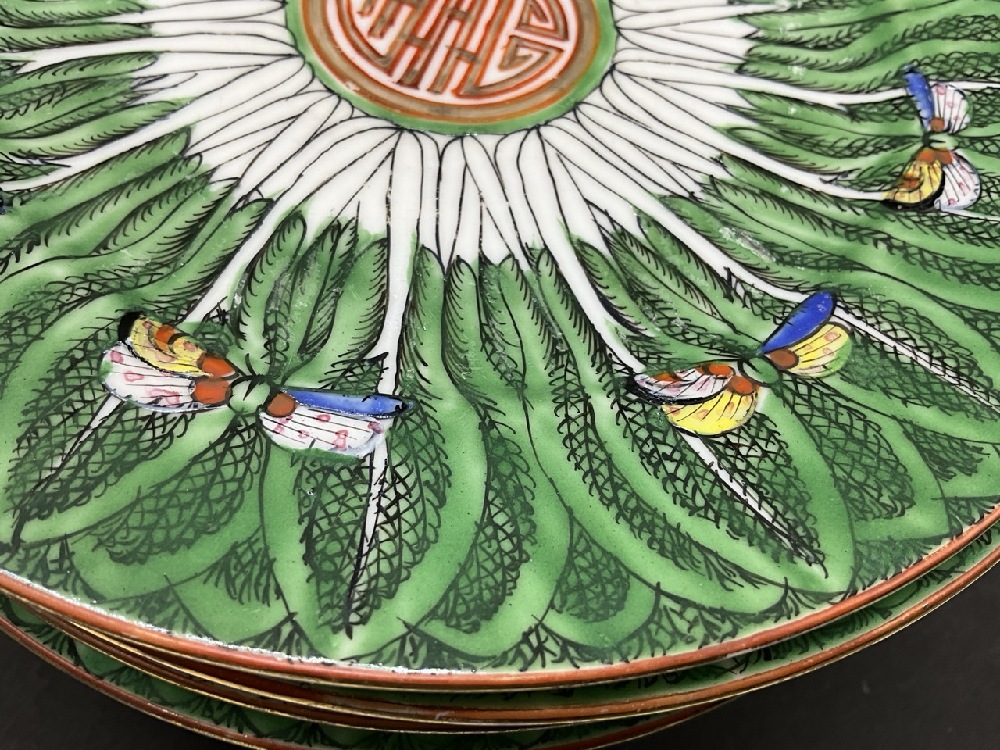 (12) Old Chinese Famille Verte Porcelain Plates. Cabbage leaf decoration with butterflies.
