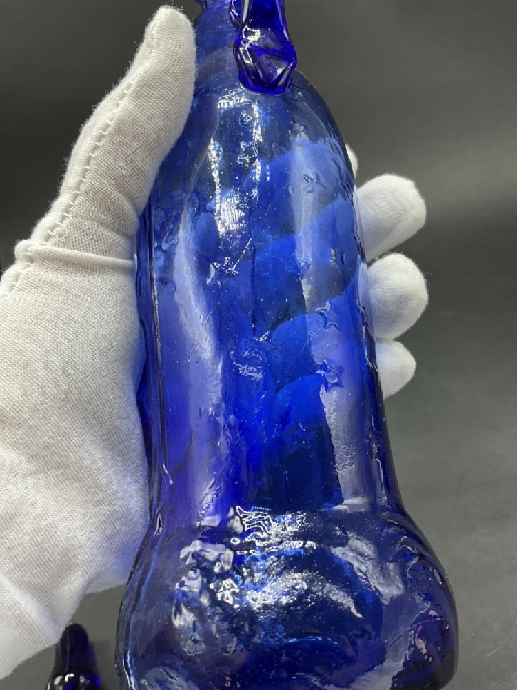 Vintage Cobalt Blue Glass Mother Mary Holy Water Bottles. Partial Made in Mexico label remains at base.
