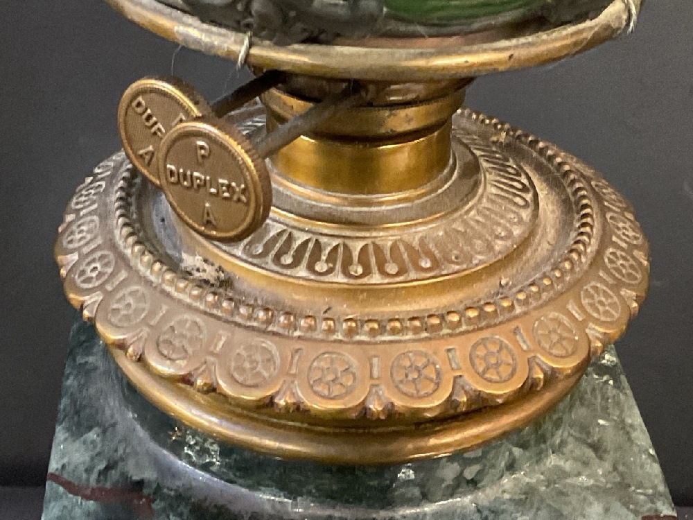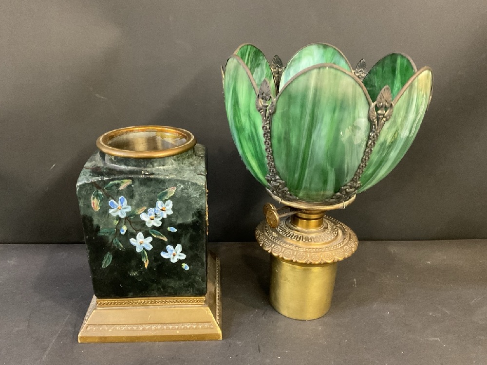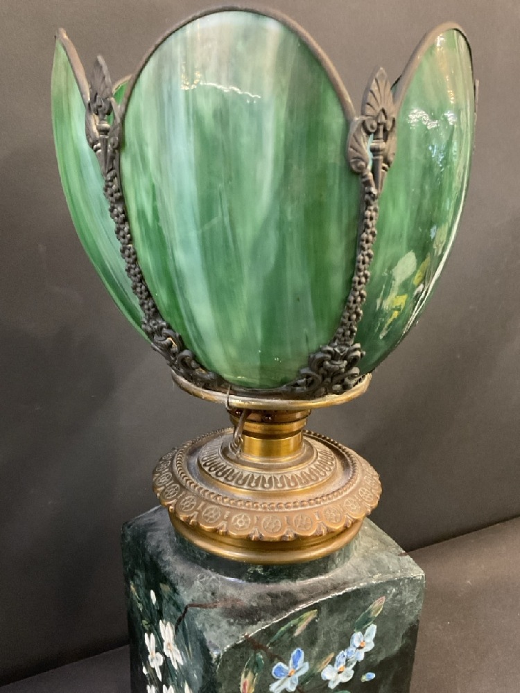 Antique Ceramic And Brass Oil Lamp With Slag Glass Shade.