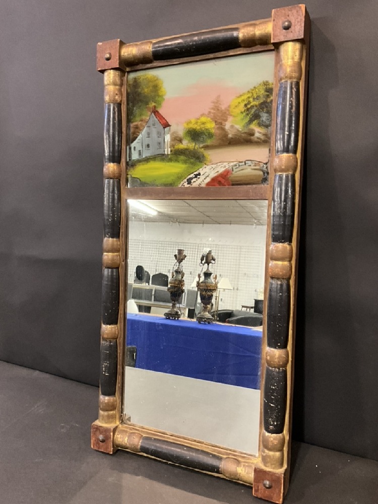 Antique Federal Reverse Painting Glass Gold Gilt Mirror. Dimensions: 24” x 12”