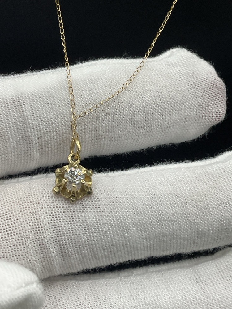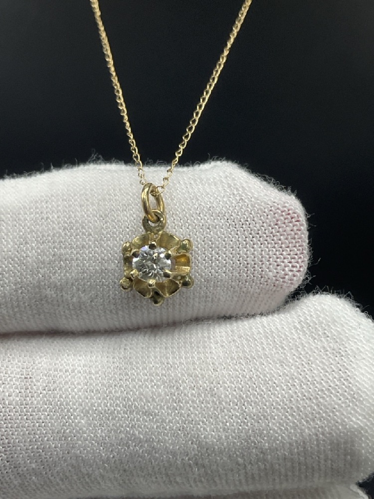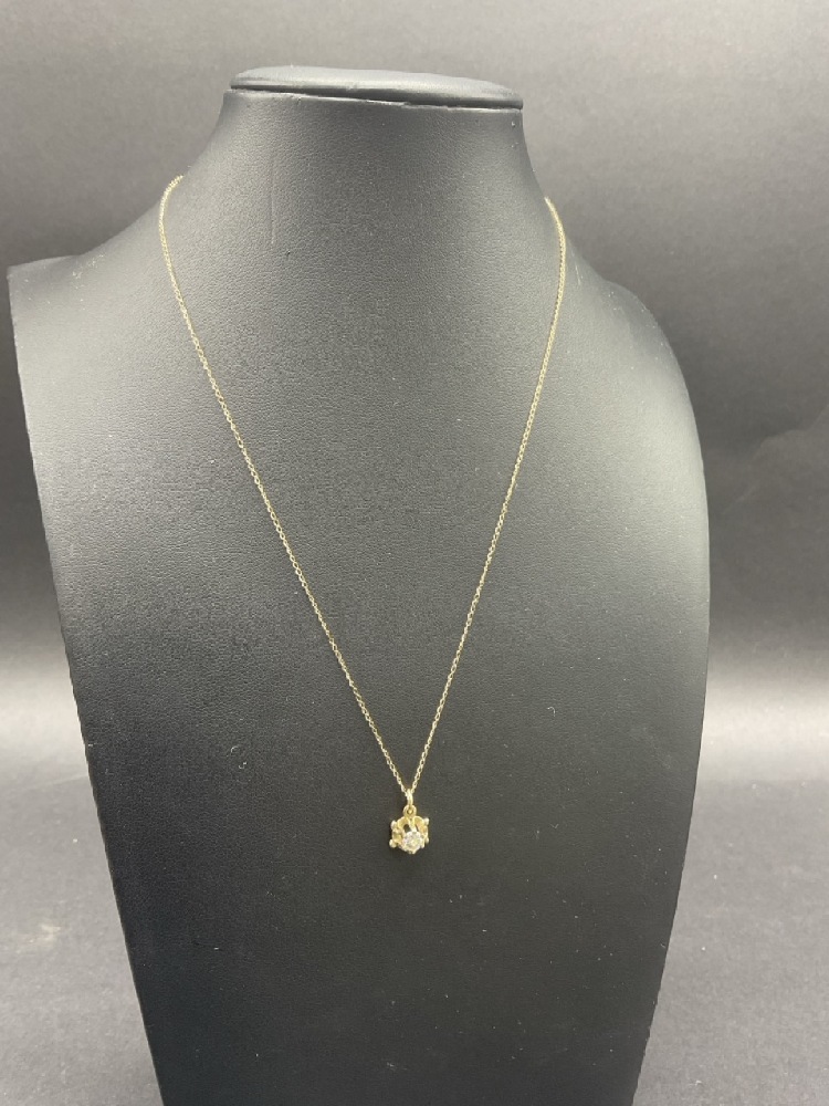 14K Diamond Solitaire Necklace 16” Snowflake Mount.