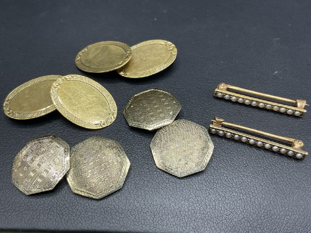 10K Yellow Gold Cufflinks 4.7g, 14K Yellow Gold Pearl Bar Pins 2 grams and 8K White Gold Cufflinks 3.6g.