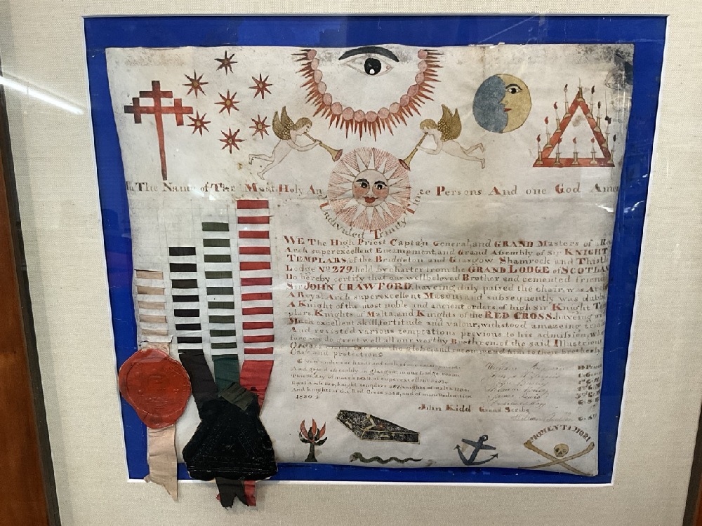 1830 Masonic Presentation to John Kidd. Hand painted on Vellum (Animal Hyde) with wax seals attached to silk ribbons. Please see photograph preview.