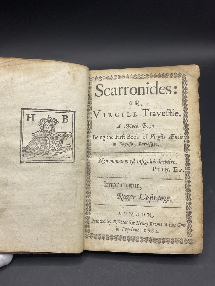 Cotton, Charles 1664 scarronides or Virgile Travesties, a Mock-Poem, being the first book of Virgil’s Aeneis in English Burlesque, 12 mo. Full Contmporary Calf neatly Rebacked , London Printed by E. Cotes for Henry Brome at the Gun in Ivy Lane, 1664