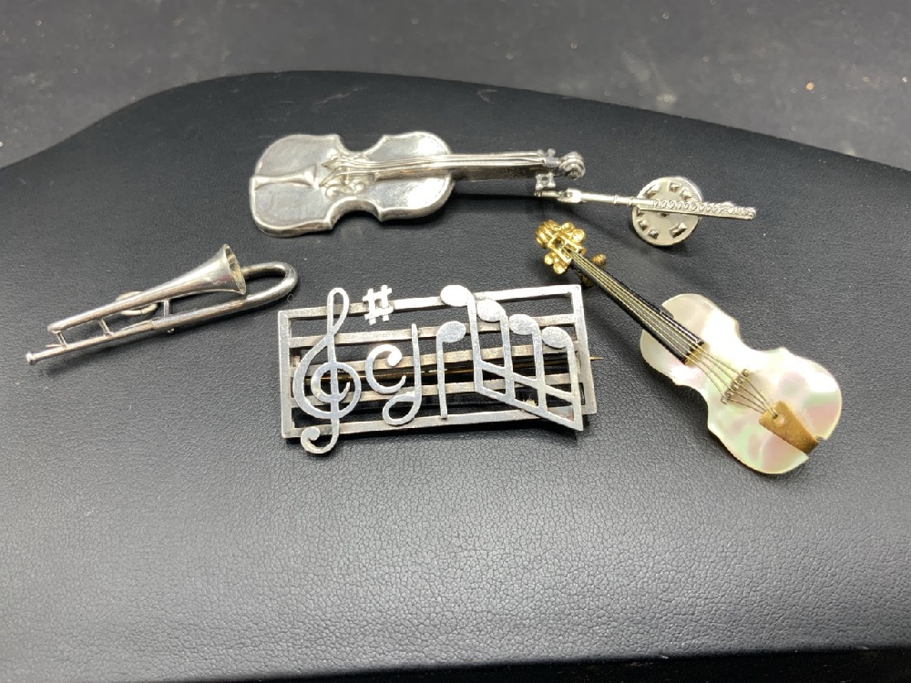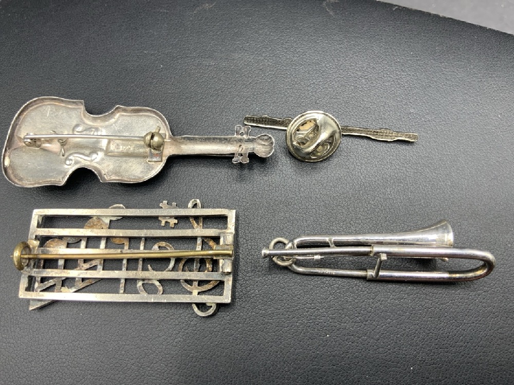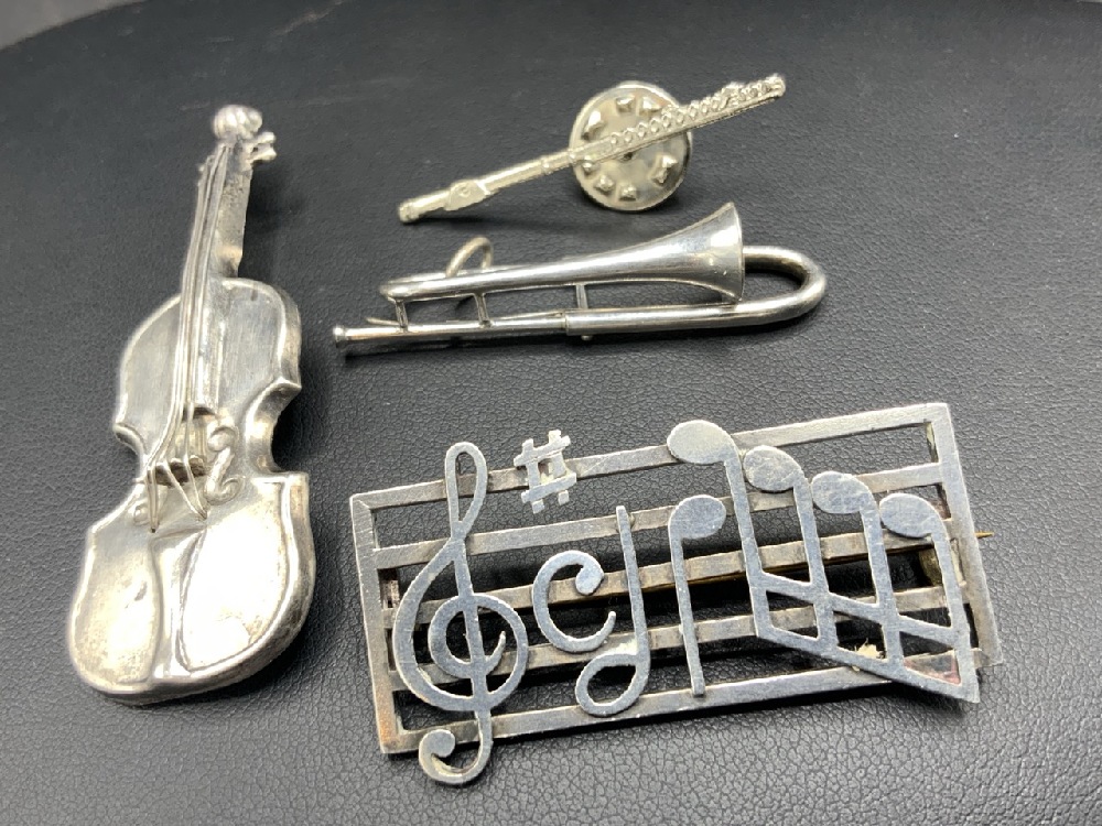 Musical Instrument Jewelry Pin Lot with Sterling Silver.