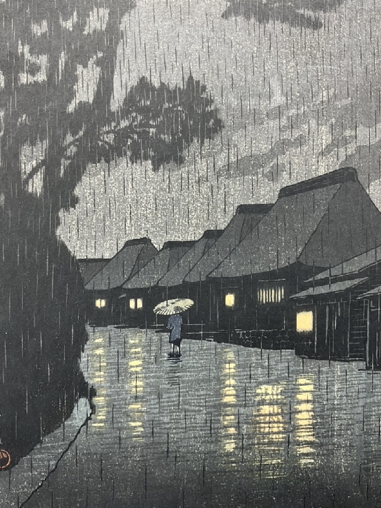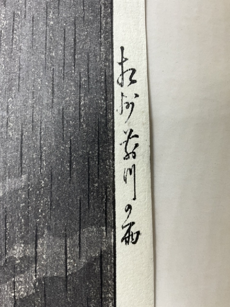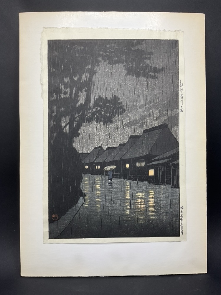 Kawase Hasui (1883-1957) Japanese Woodblock Print (1932) “Rain at Maekawa” Mounted on Foam Board.