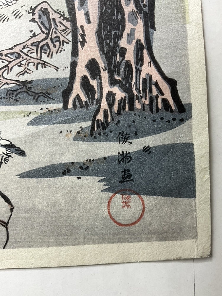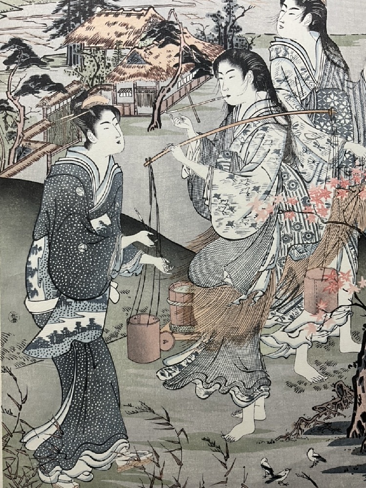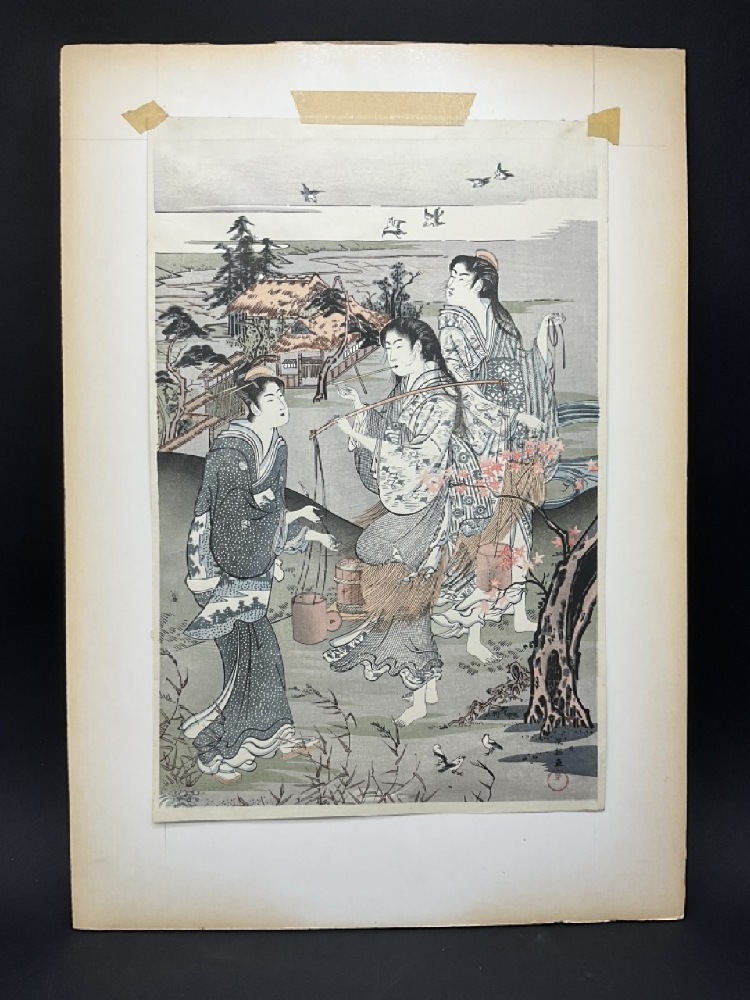 Kubo Shunman (1757-1820) Japanese Woodblock Print (1932) “Brine Maidens by the Tama River of Noda mounted on foam board.