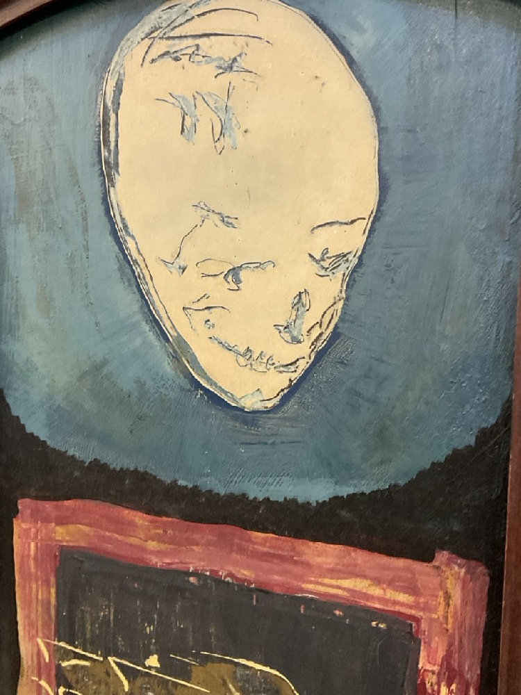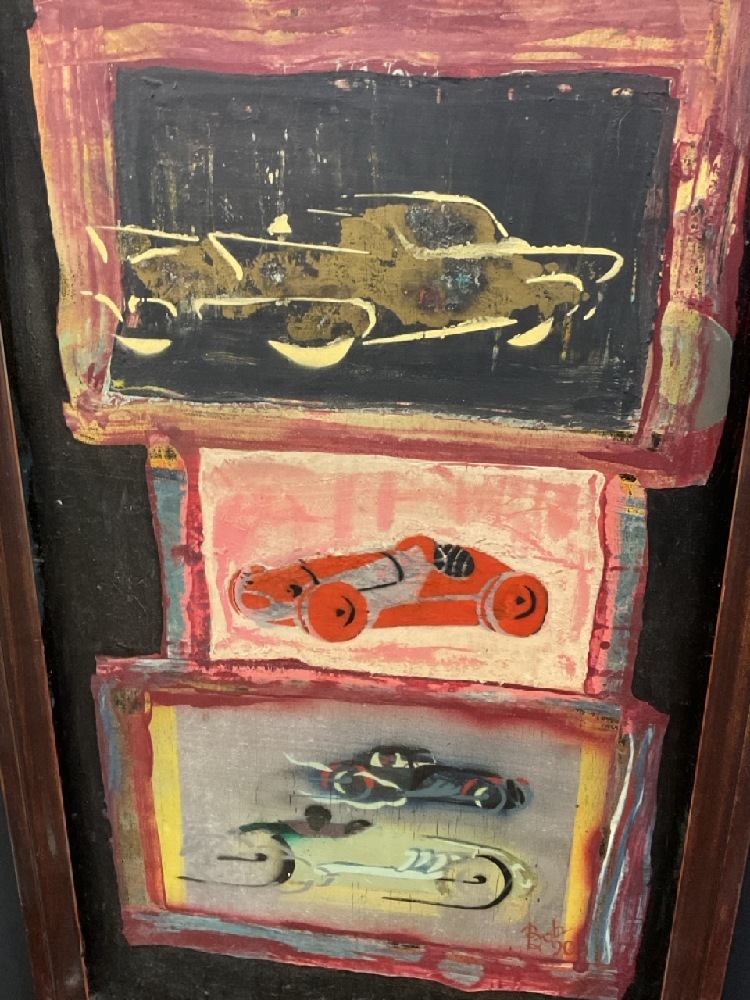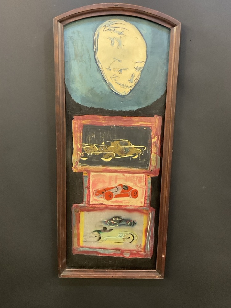 90's Unique Art Smiling Head and Cars Signed "Bob".