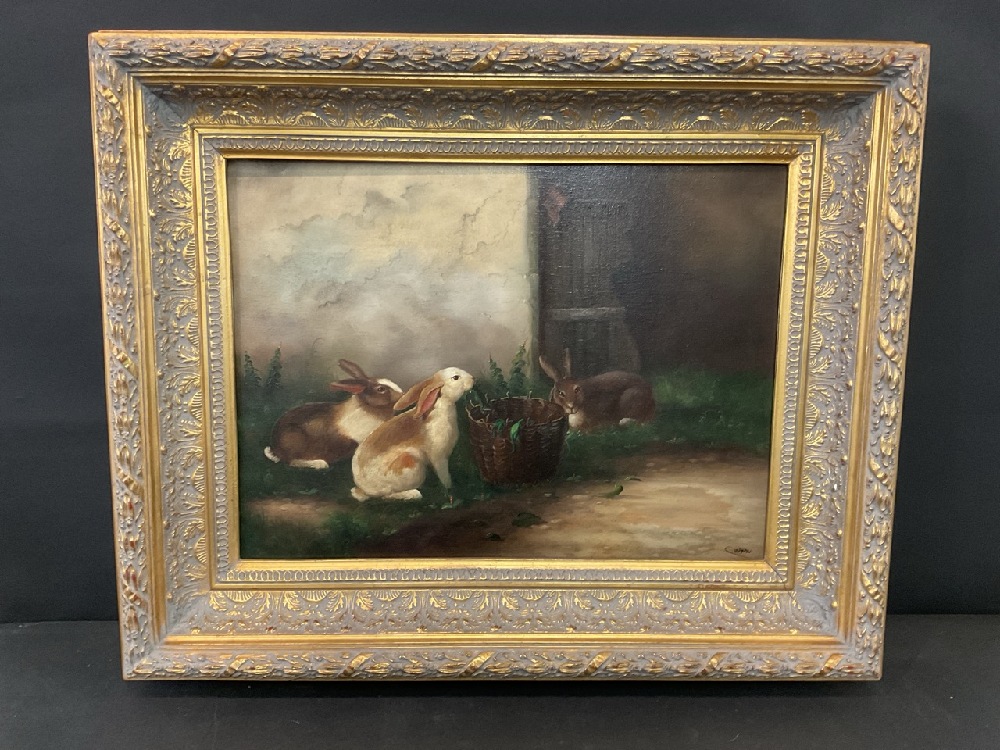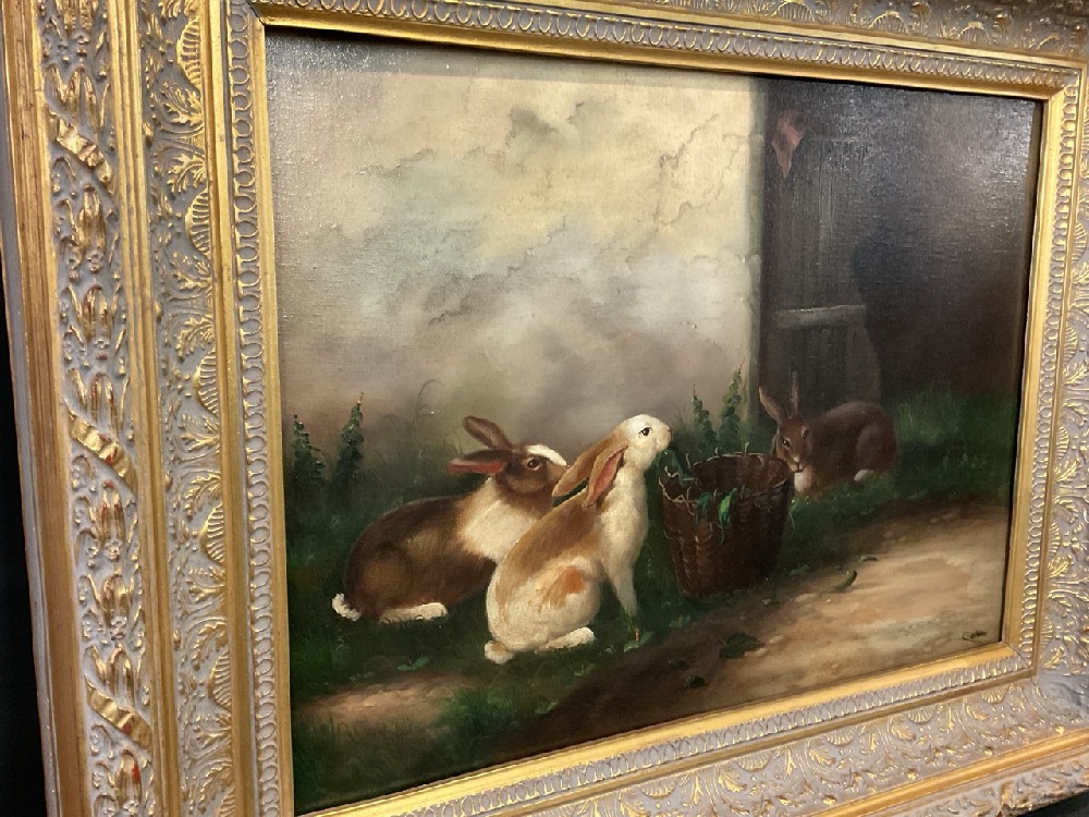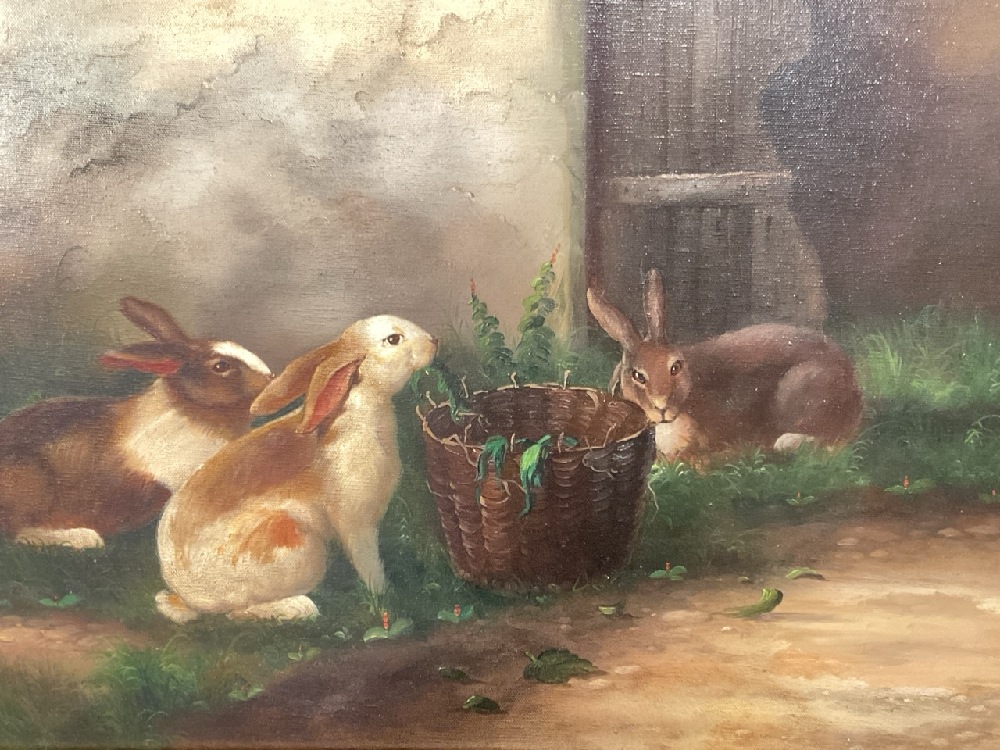 Contemporary Painting of Rabbits at a Countryside Manor Approaching Basket of Carrots.