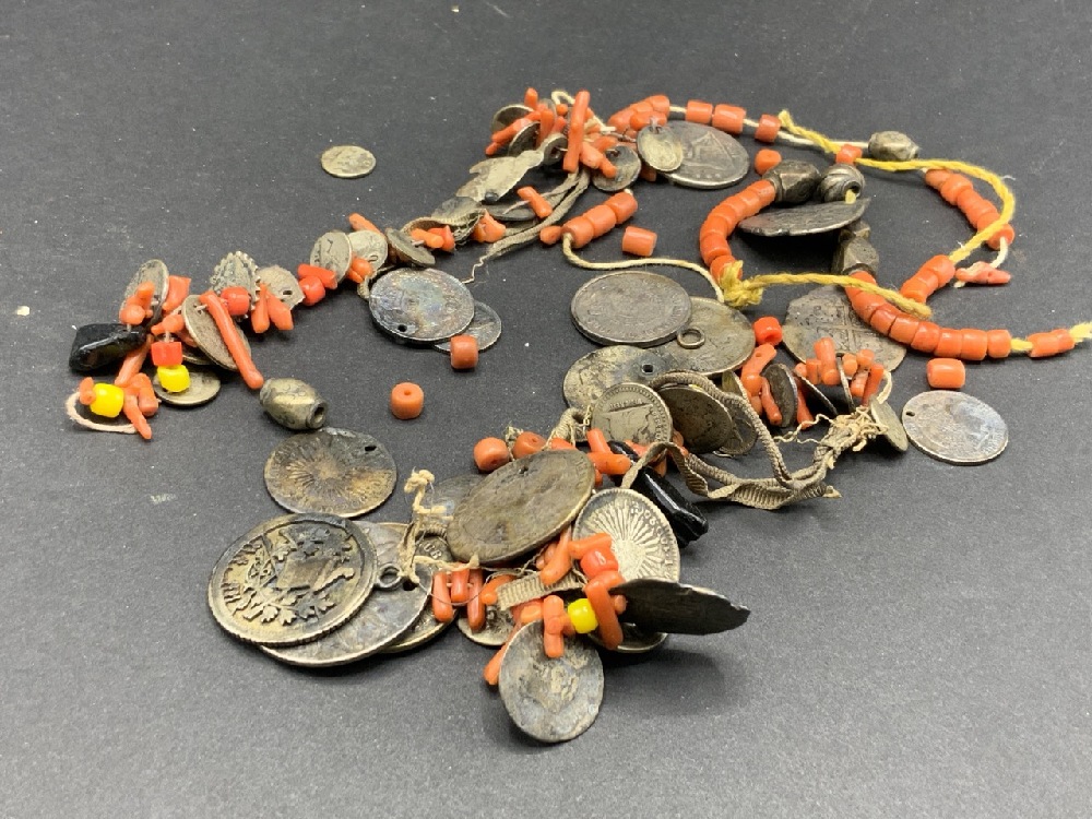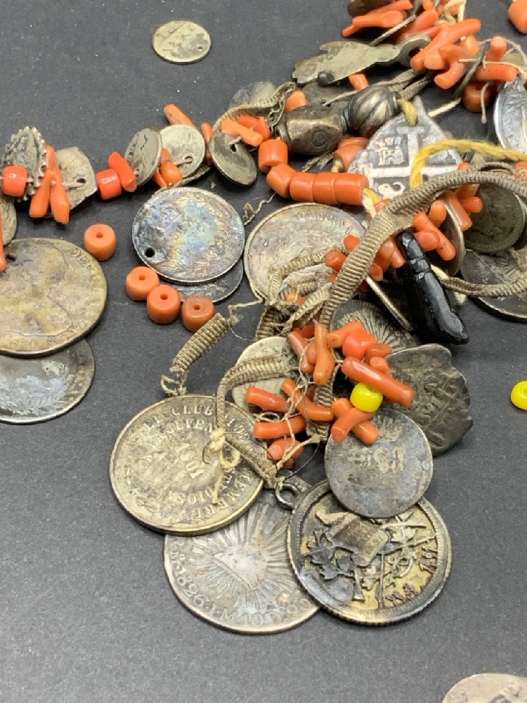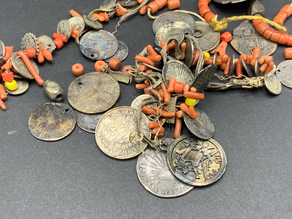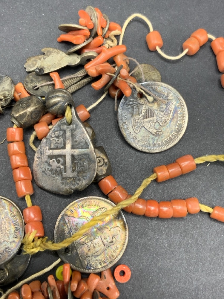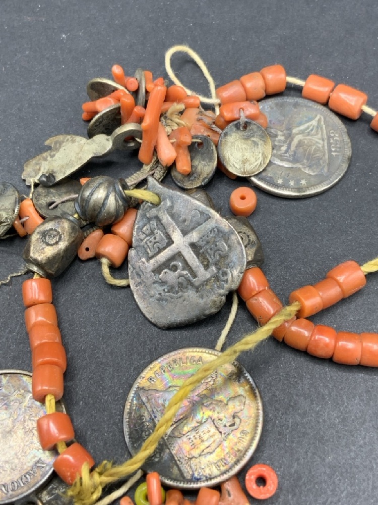 Antique Silver Coins with Silver Balls and Coral Stones.