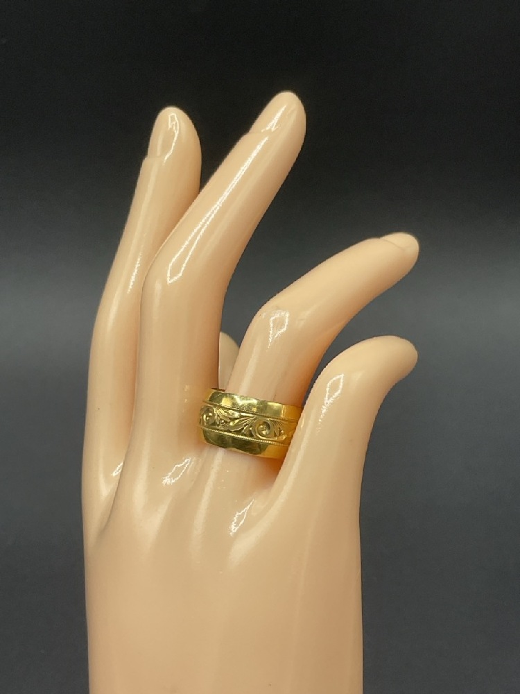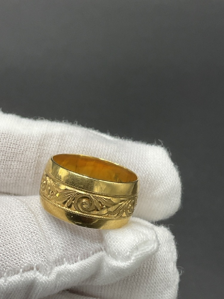 20K Yellow Gold Thick Wedding Band with Ornate Design.