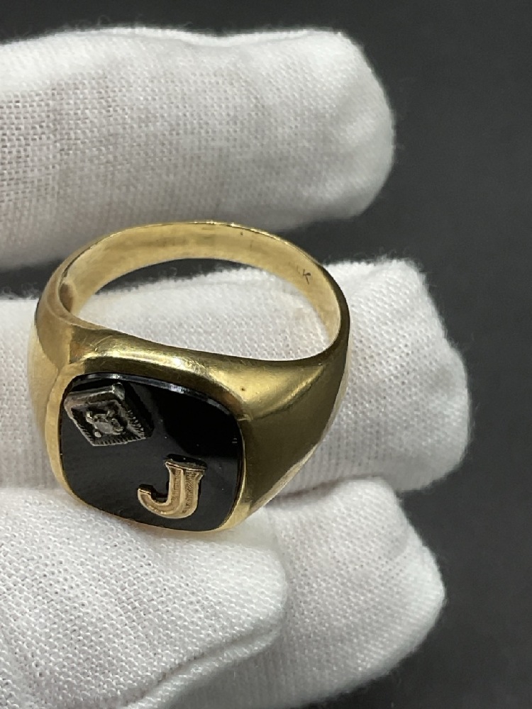 14K Yellow Gold Men's Onyx and Diamond "J" Initial Ring.