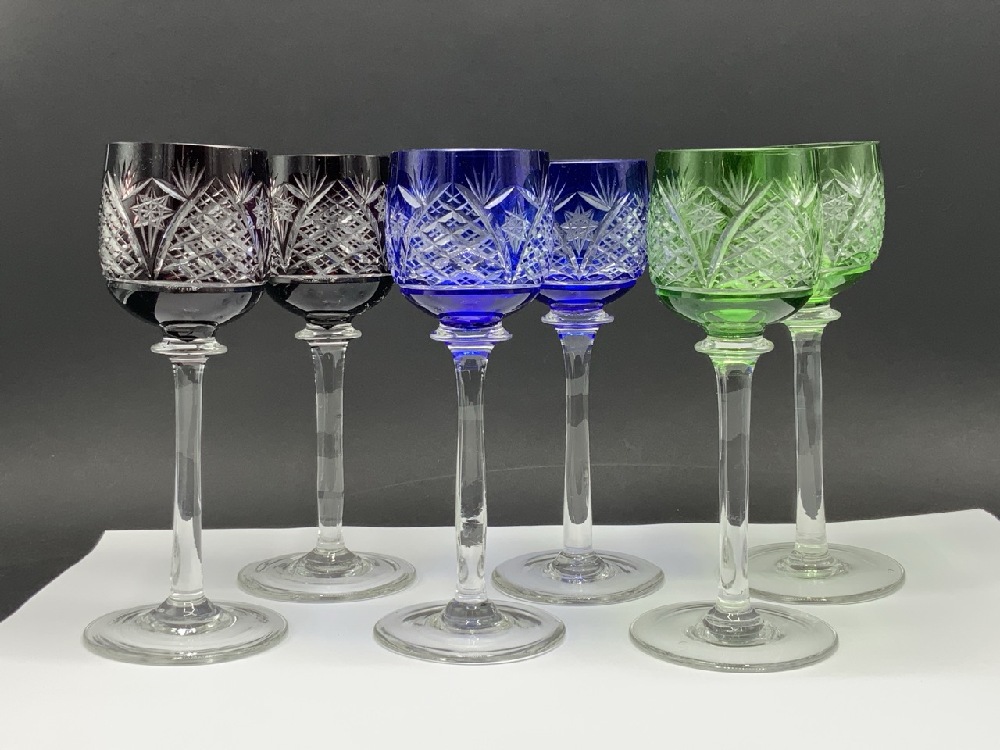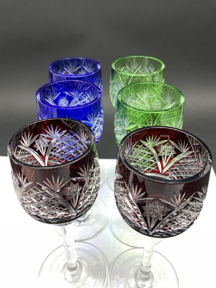 Six (6) Bohemian Cut to Clear Wine Goblets. , Ruby Red, Cobalt Blue and Green.