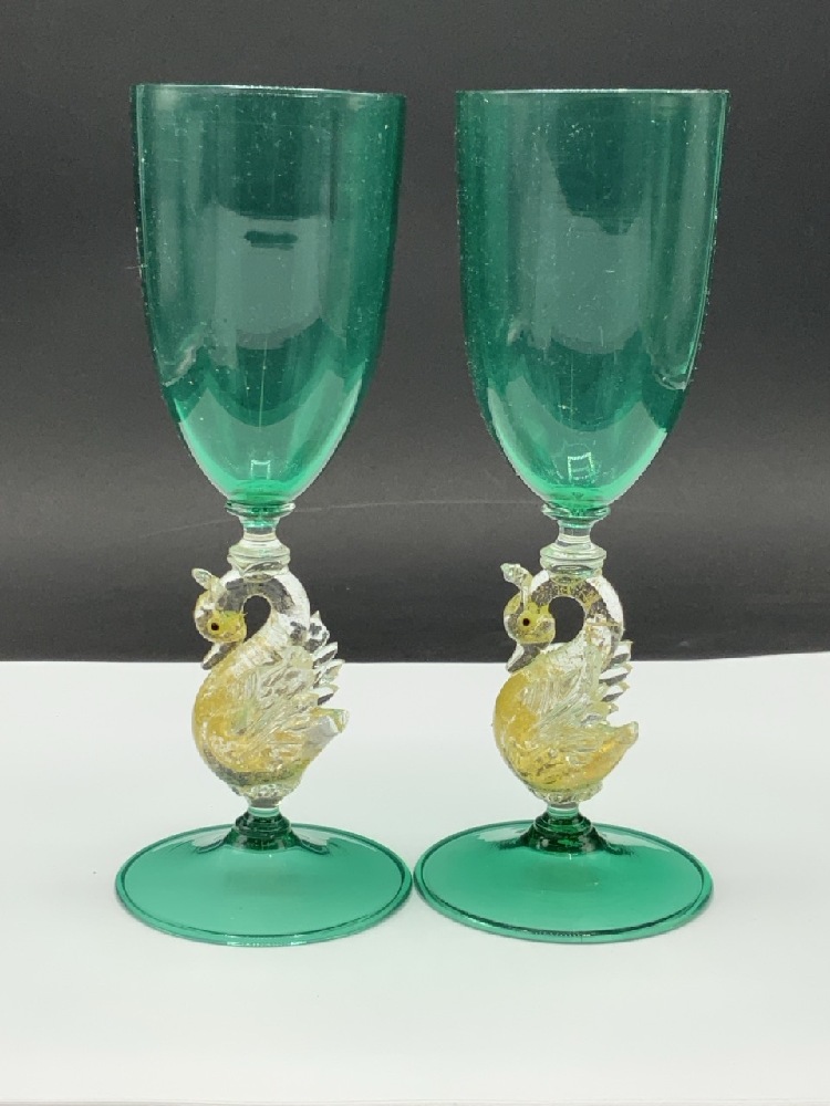 Four (4) Venetian Glass Dolphin Footed Glass Goblets. Green and Red with gold fleck.