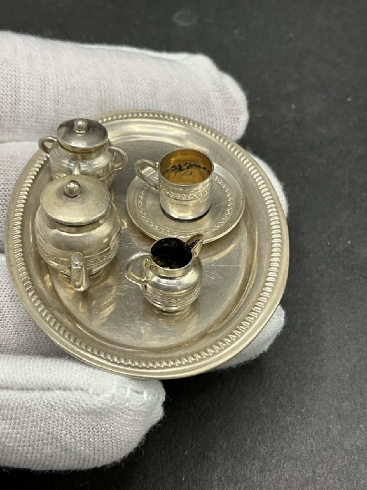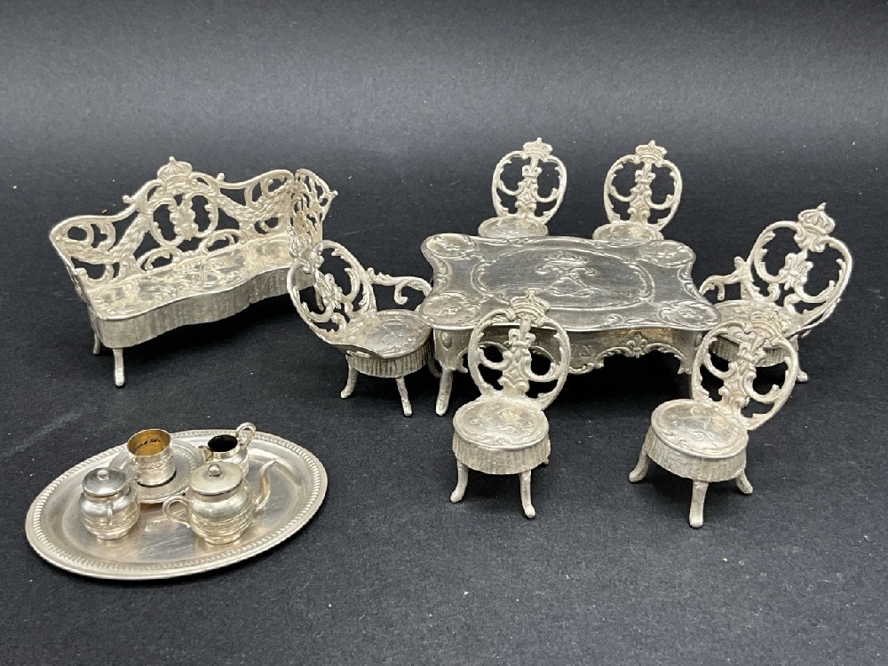 Continental Miniature Curio Size Silver Dining Room Table with Six Chairs and Settee accompanied with a silver tea set with tray (different maker).