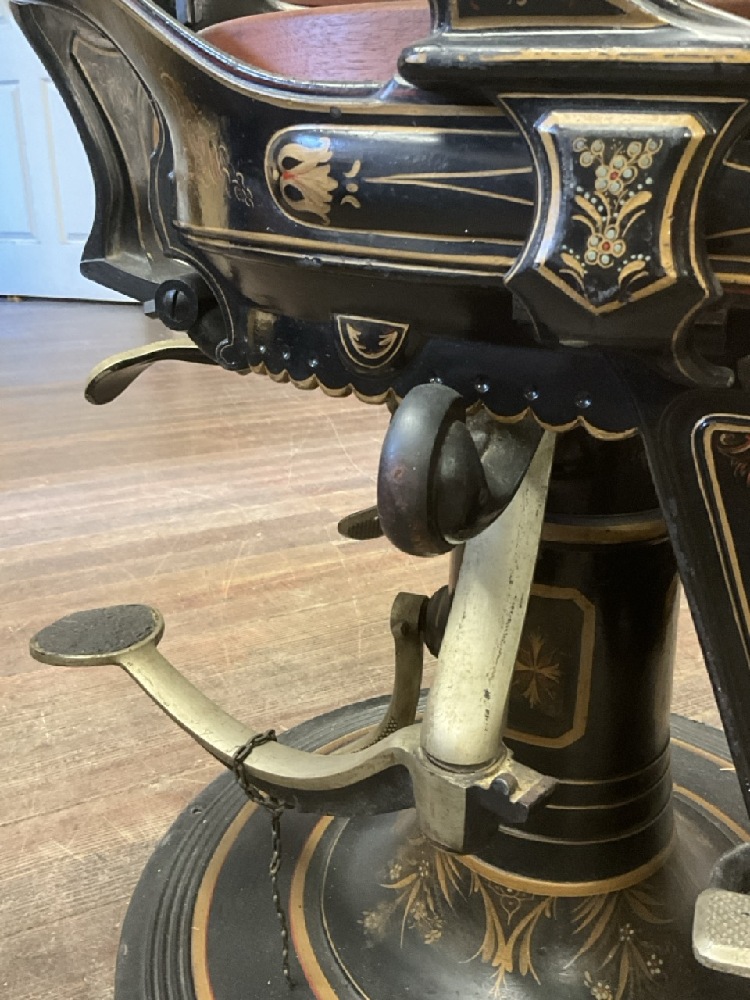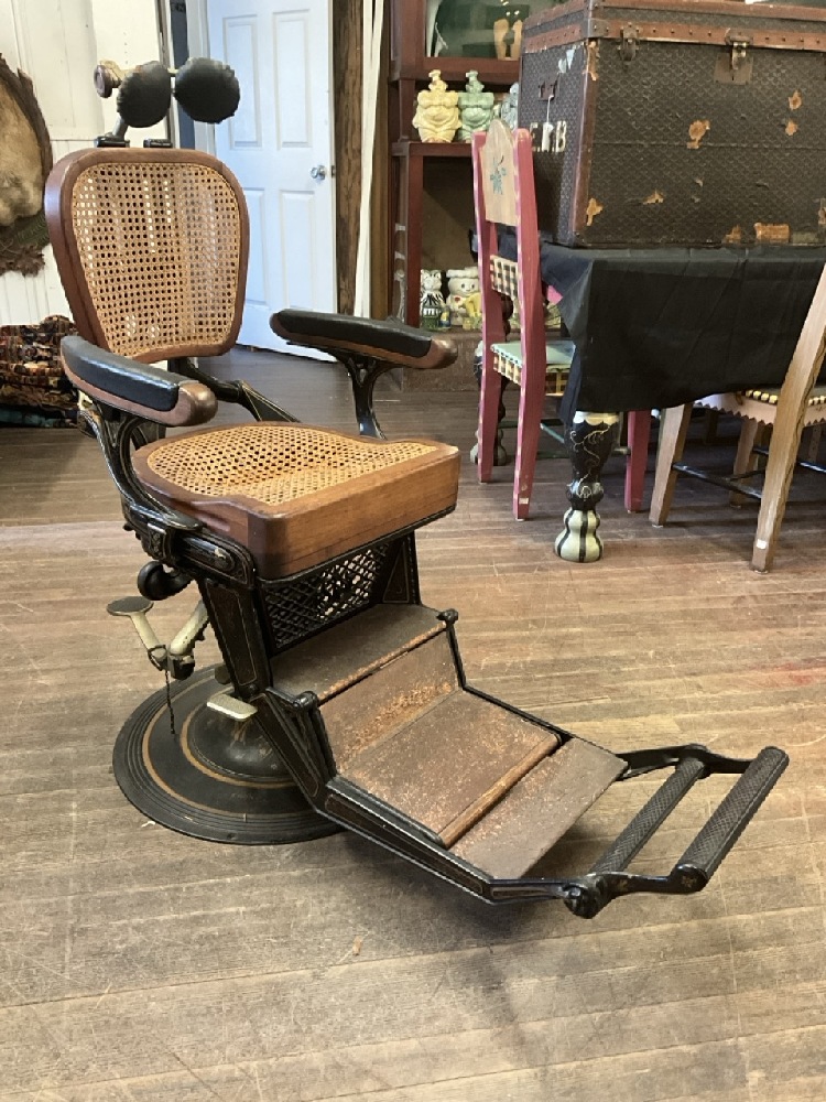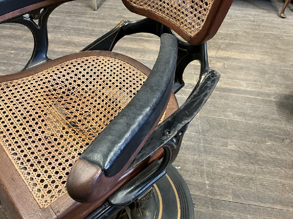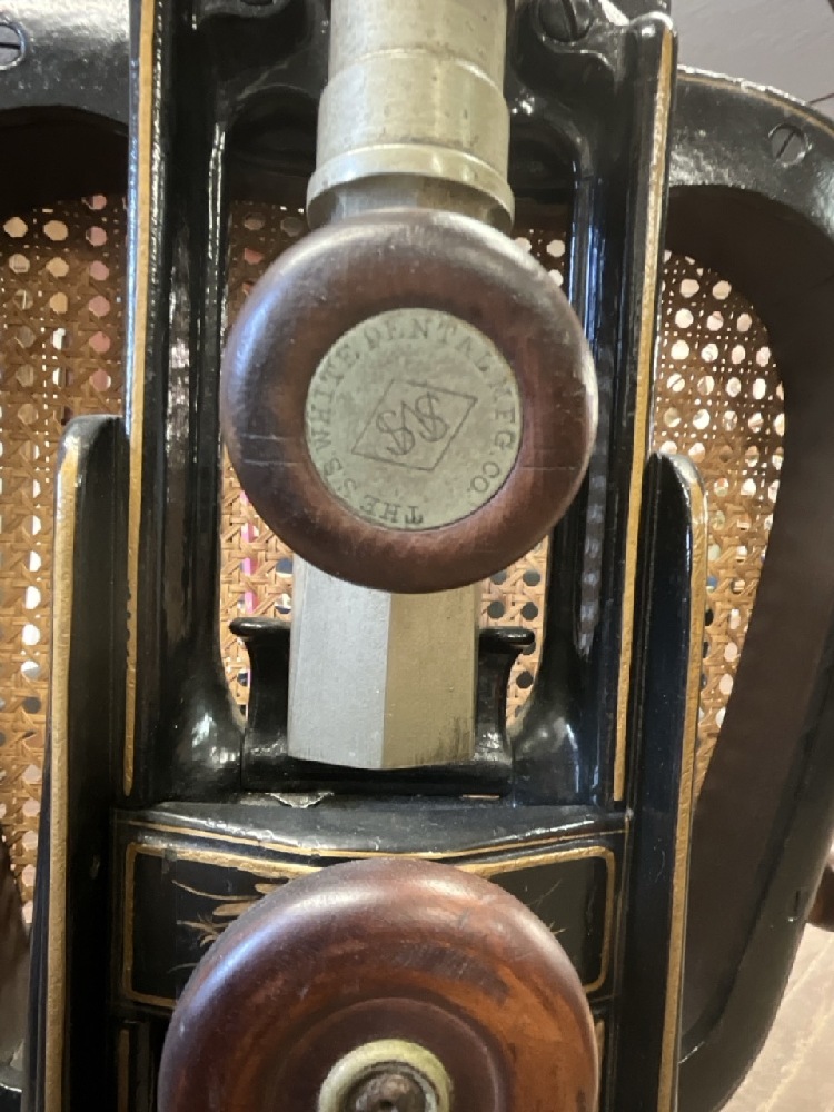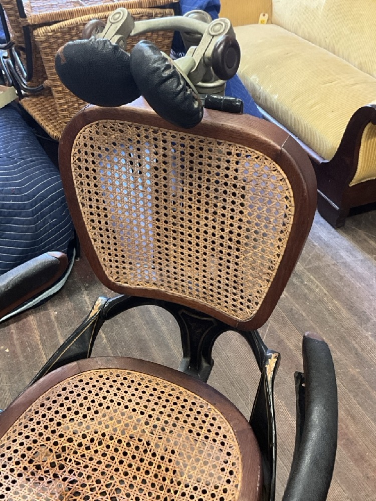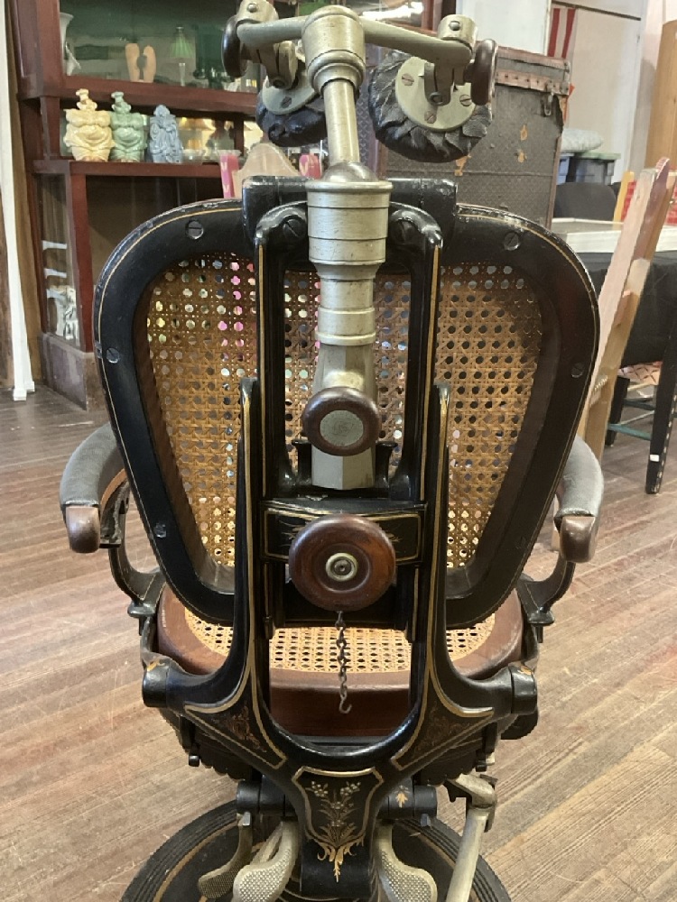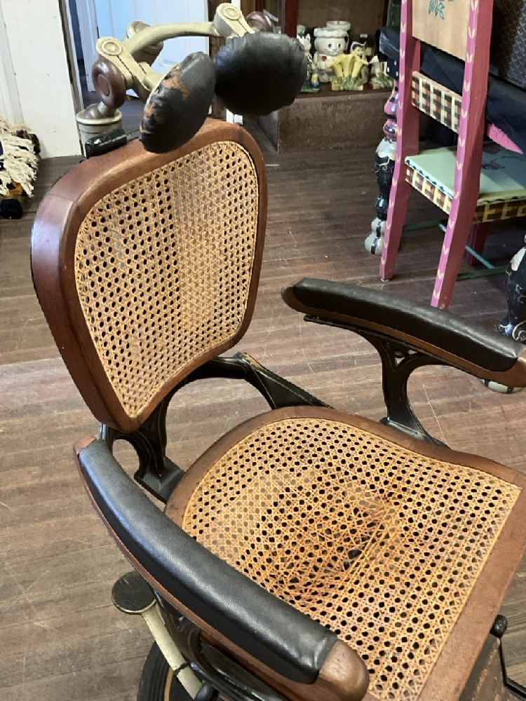 An antique dentist's patient chair c. 1900. Made by S.S. White Dental MFG. Co.. Walnut hardwood and cast iron with caned seating. Overall good patina and finish.