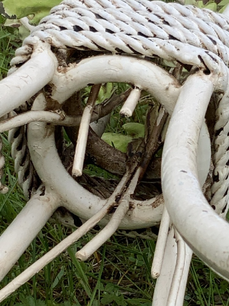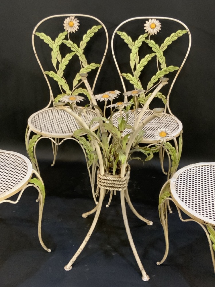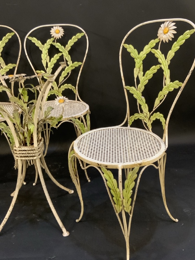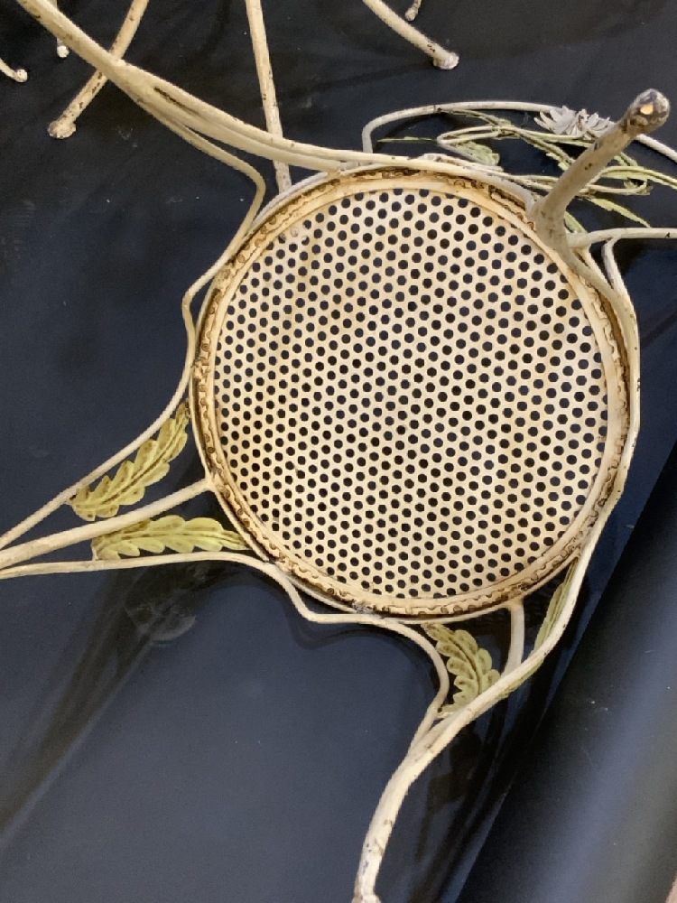 A Shabby Chic Vintage Mesh and Wrought Iron Metal Table with Four Chairs. The round glass top is not included. Base only with four chairs. A new round glass top will be needed.