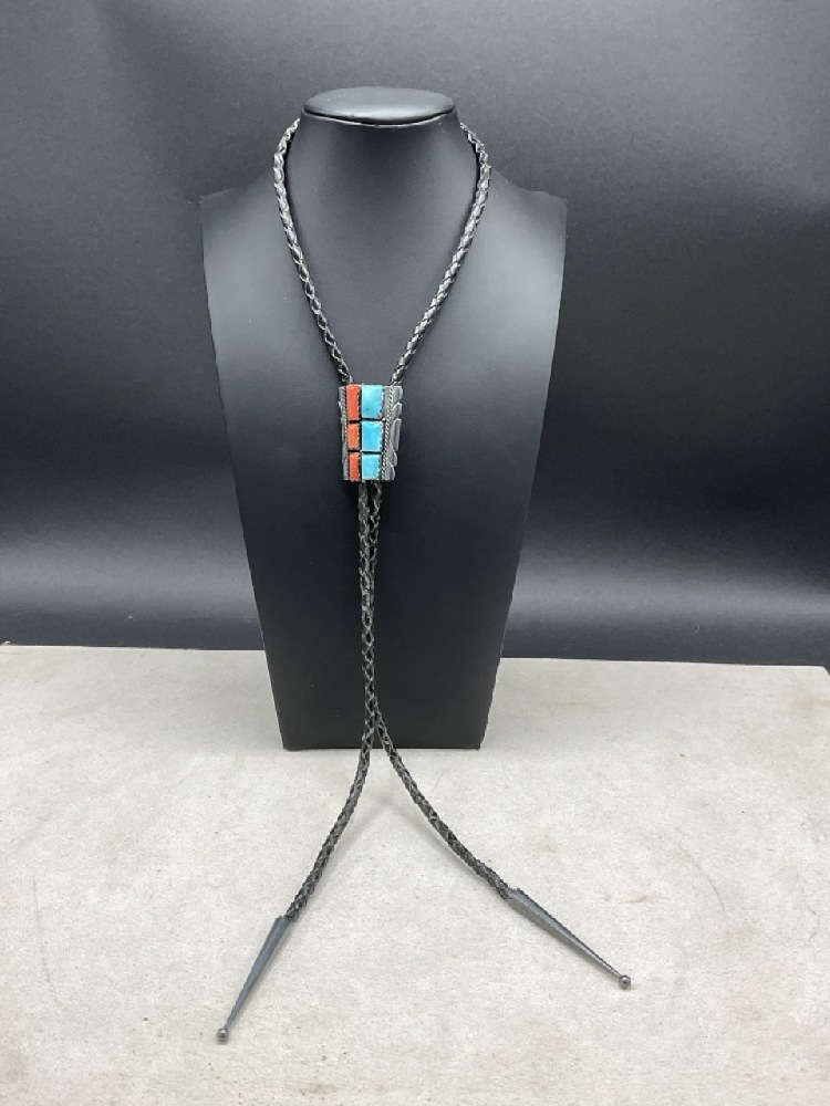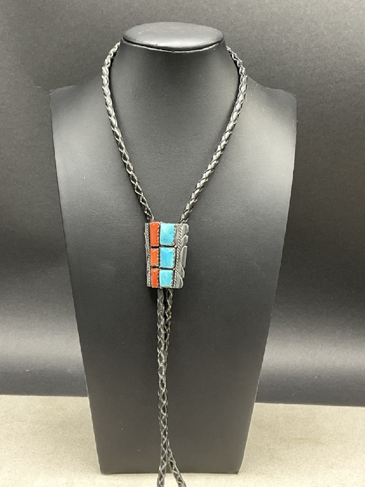 Turquoise and Coral Sterling Silver Bolo.