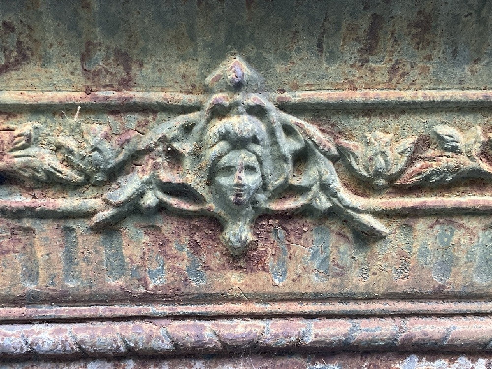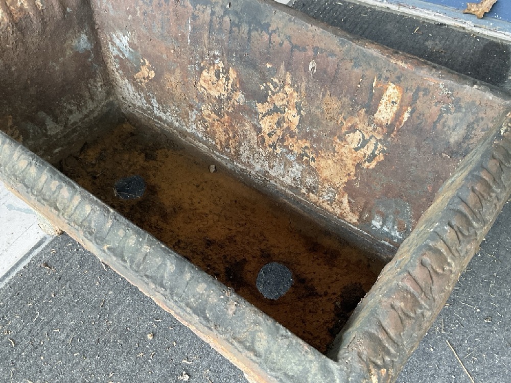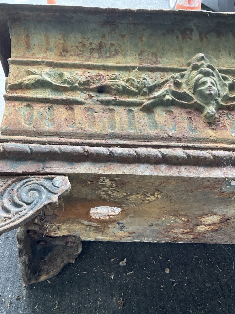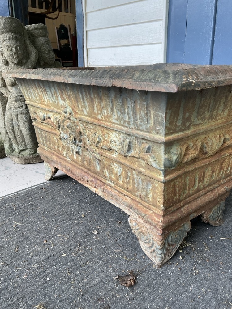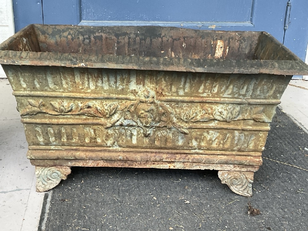 Cast Iron Art Nouveau period footed garden box planter. A rectangular form with four bolted feet.