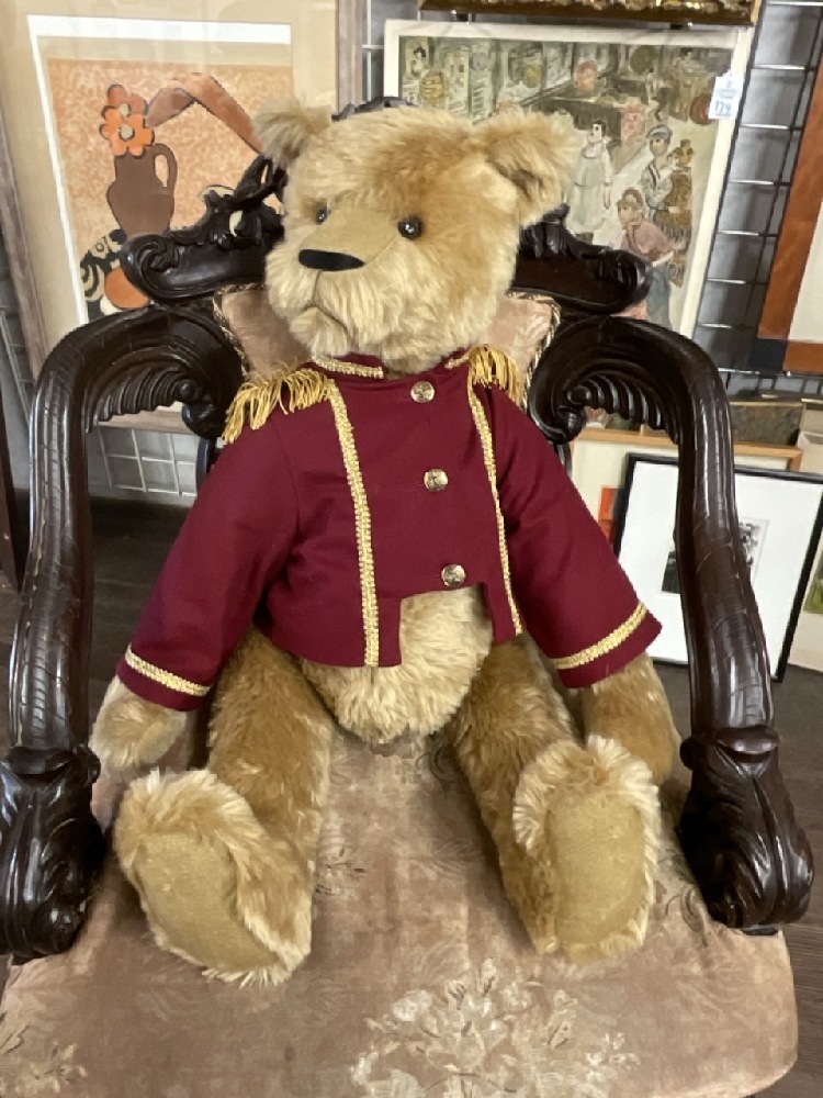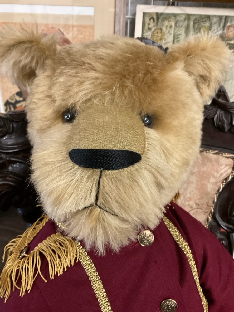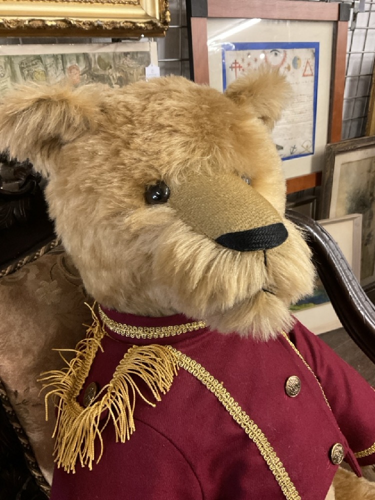 Huge 30" Mohair Lion (Bear) Stuffed Animal. High Quality construction artist piece. Unknown artist as no signature found. The Lion has a "Yes/No" jointed head. Wearing a royalty red coat.