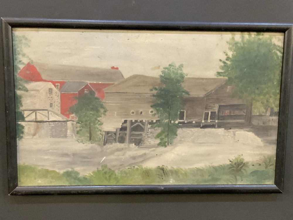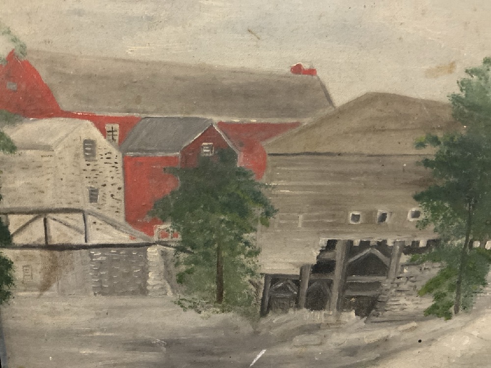 Folk Art Oil on Board Mill Painting. Oil on masonite board.