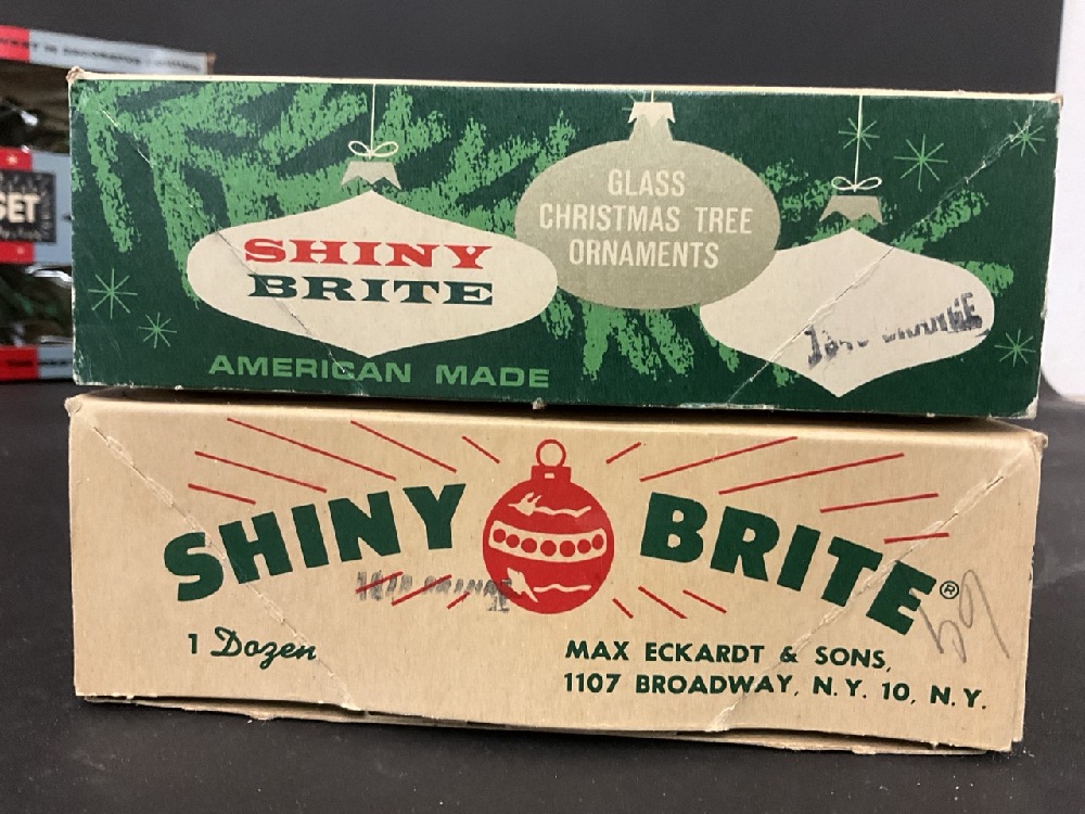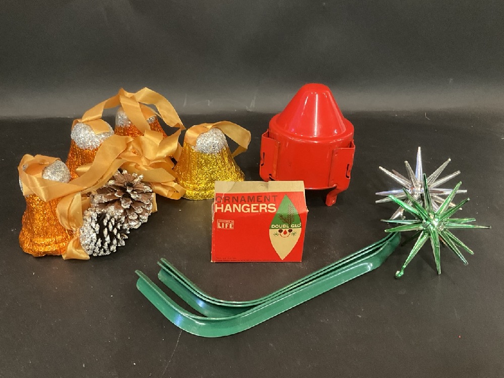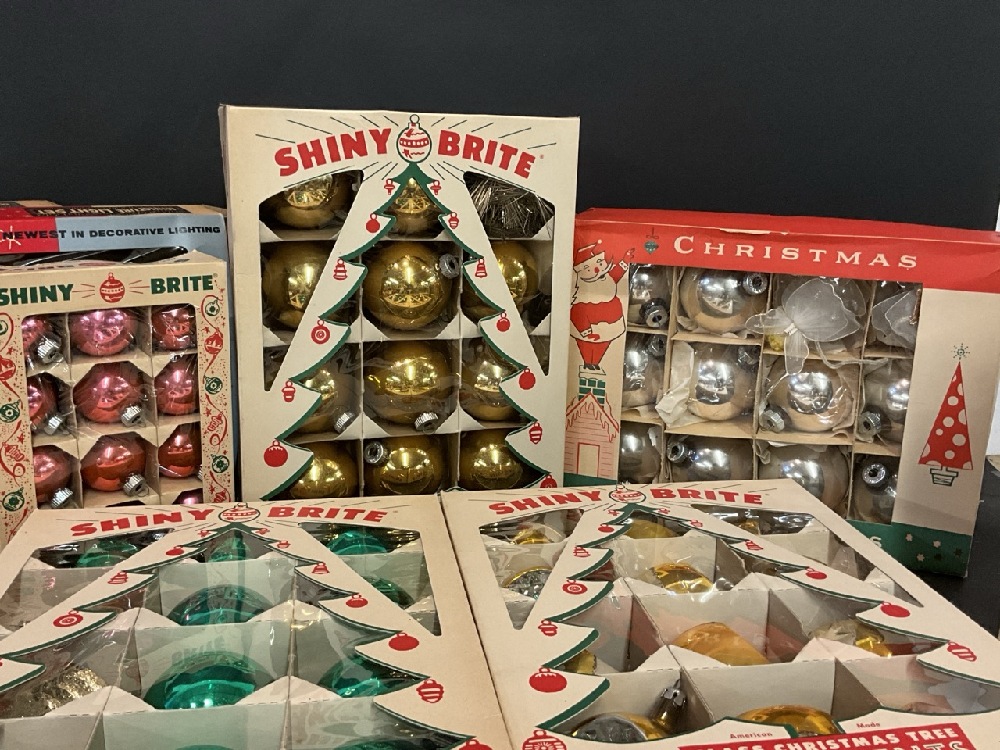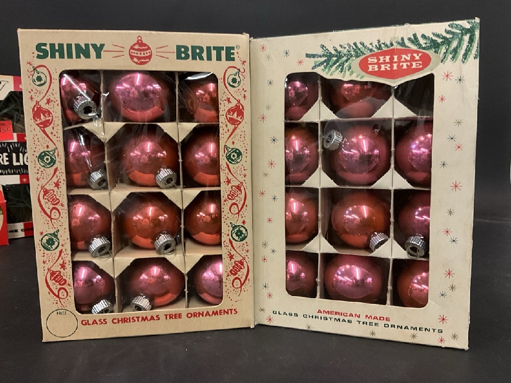 Vintage Christmas Lot with Shiny Brite Ornaments with Lights, Tree Stand