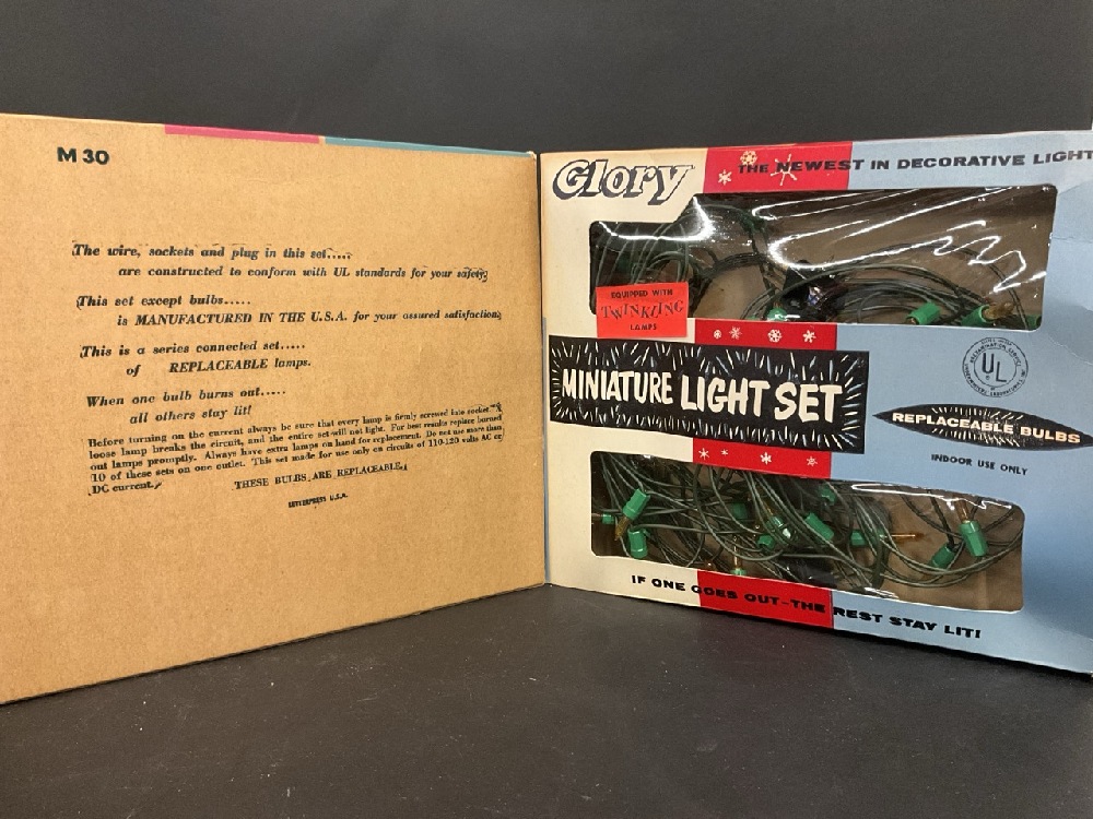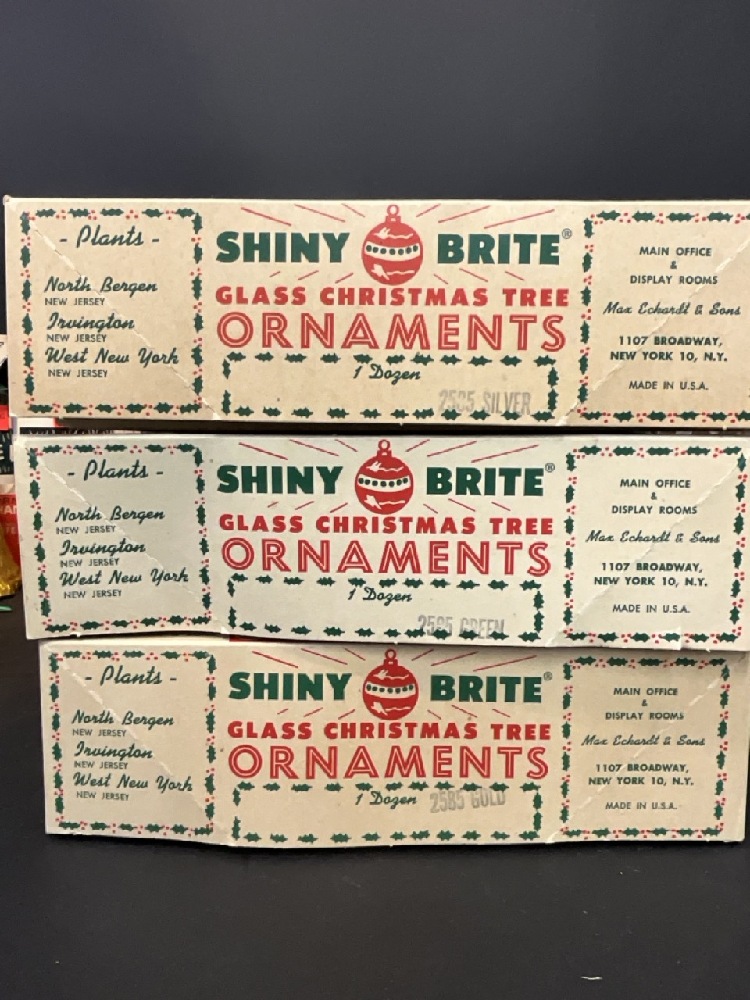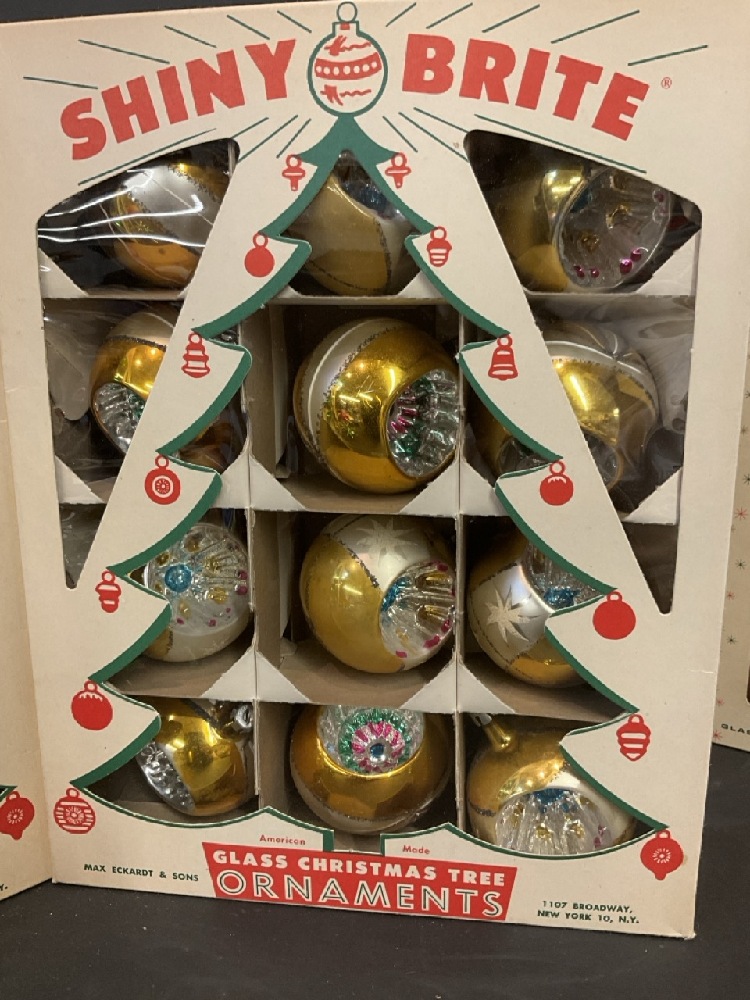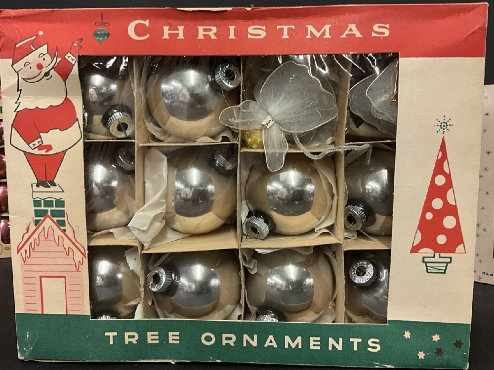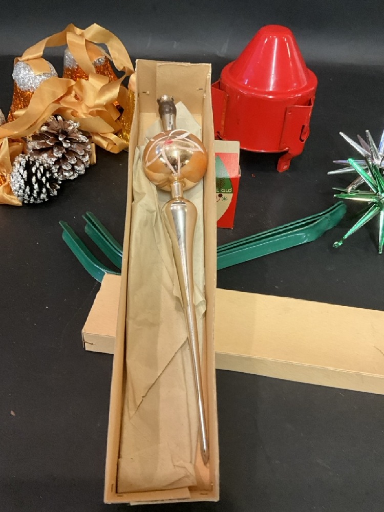 Vintage Christmas Lot with Shiny Brite Ornaments with Lights, Tree Stand