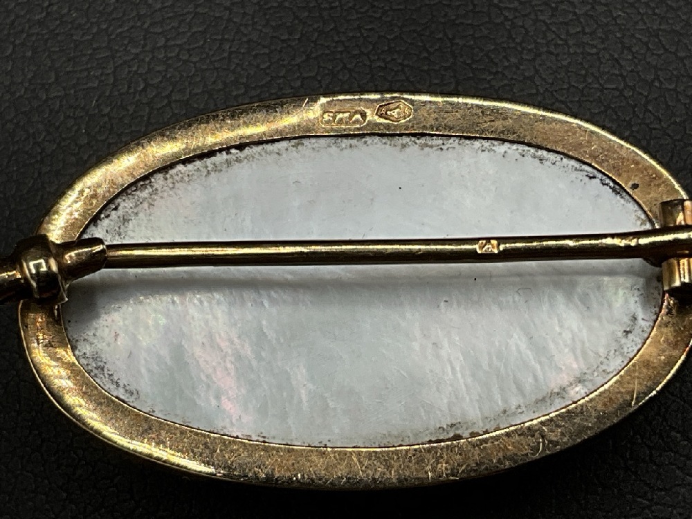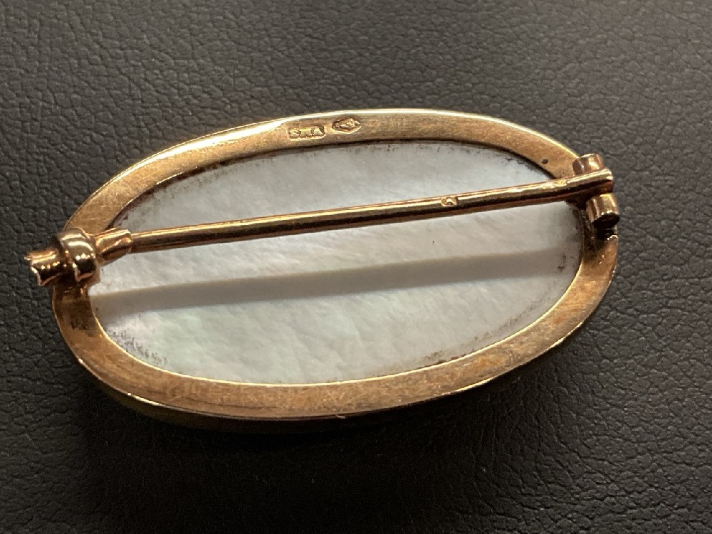 An Antique 18K Yellow Gold Austrian MOP Pin with Hand Painted Purple Tiger Lillies.