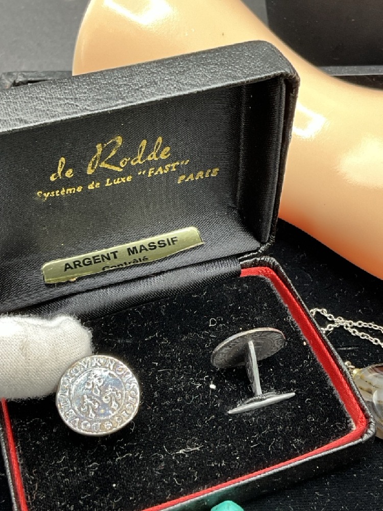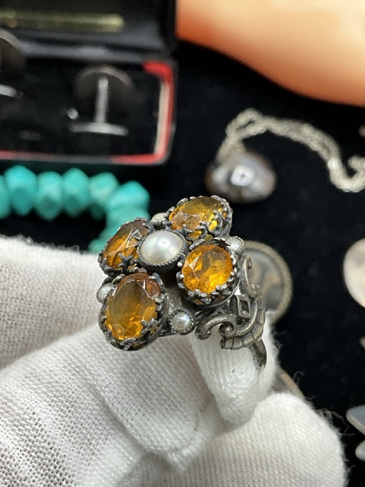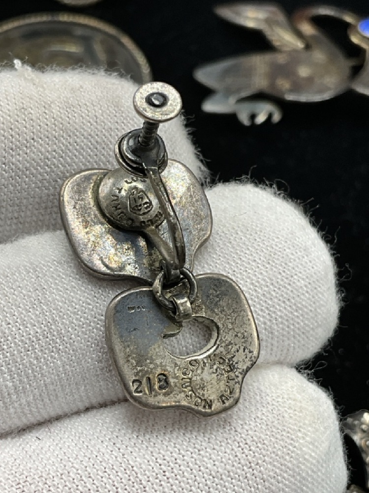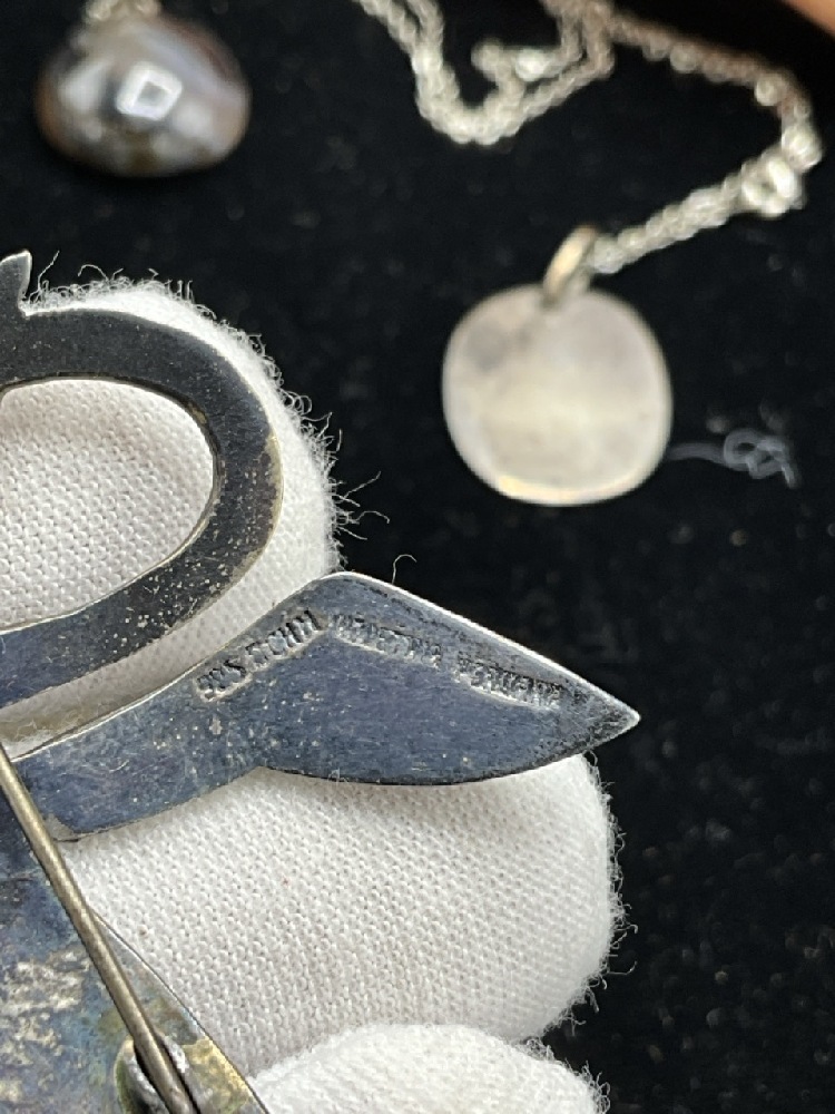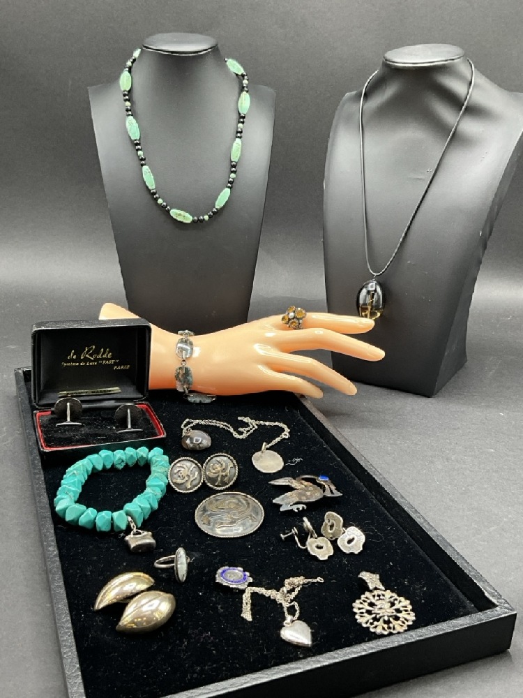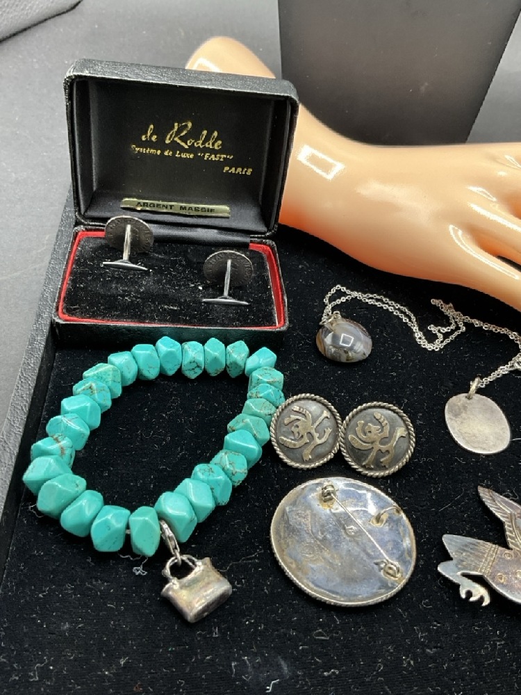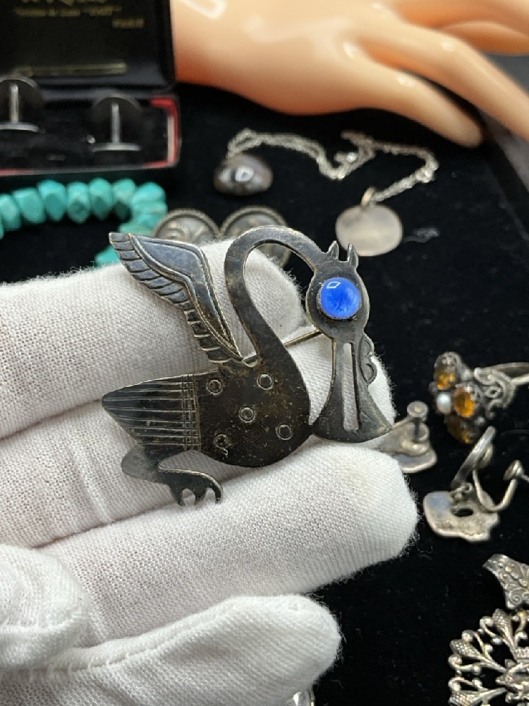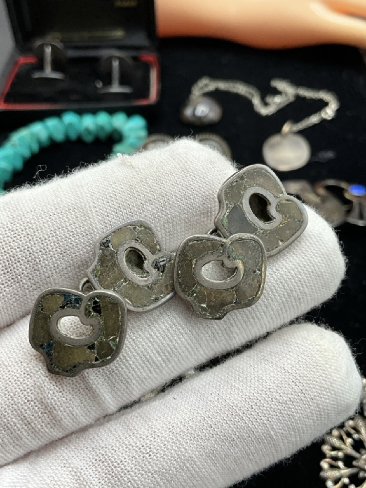 Estate Compiled Sterling SilverJewelry Group. Antique moss agate bracelet, Mexican sterling, Turquoise, Los Castillo Taxco earrings etc. As seen in photograph preview.