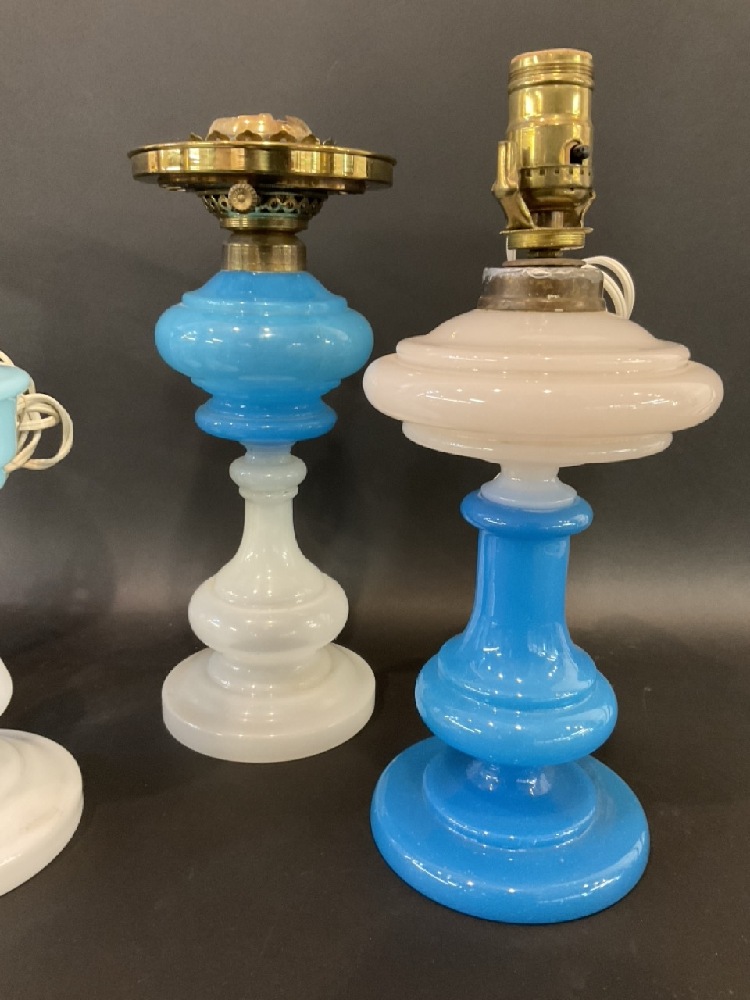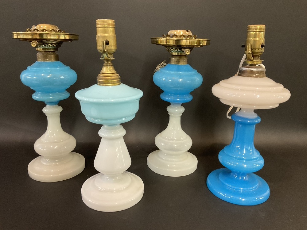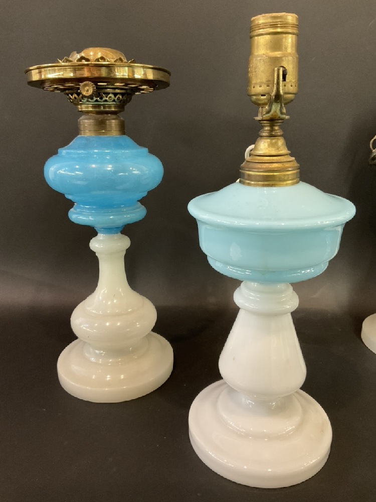 (4) Vintage Blue & Milk Glass Oil Lamps.