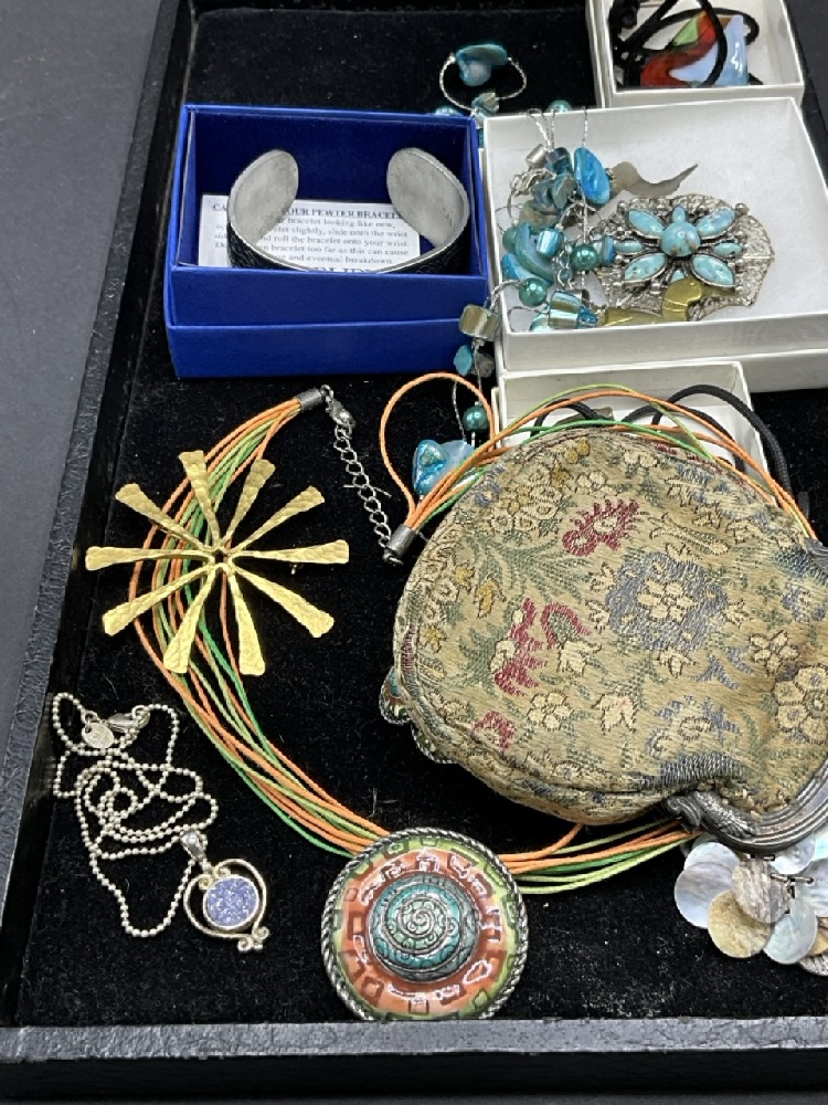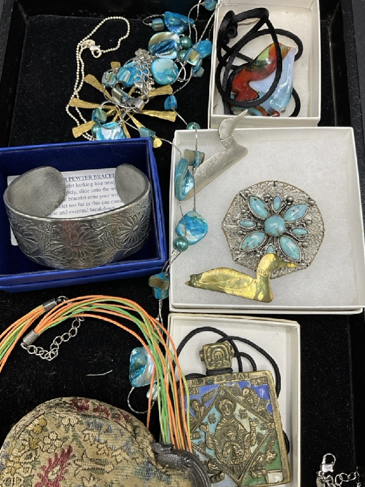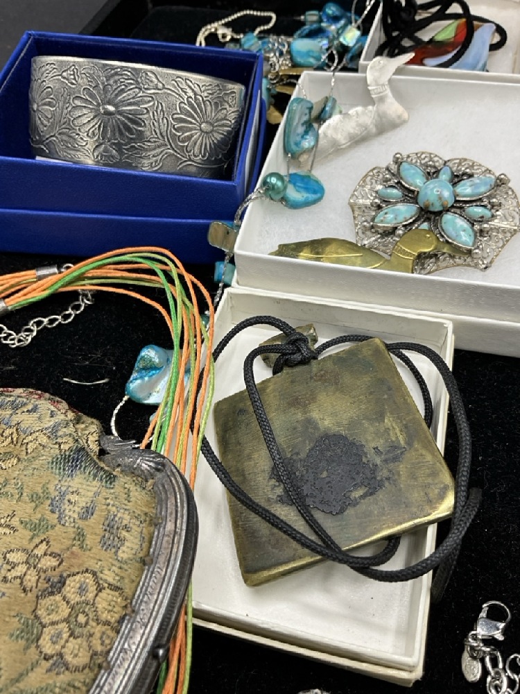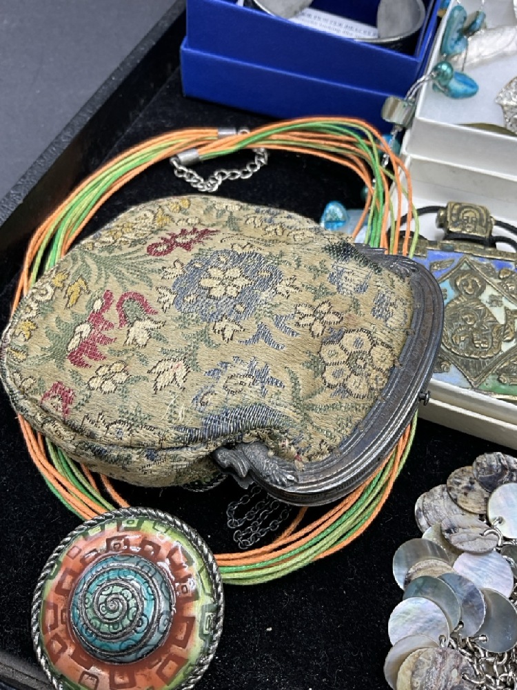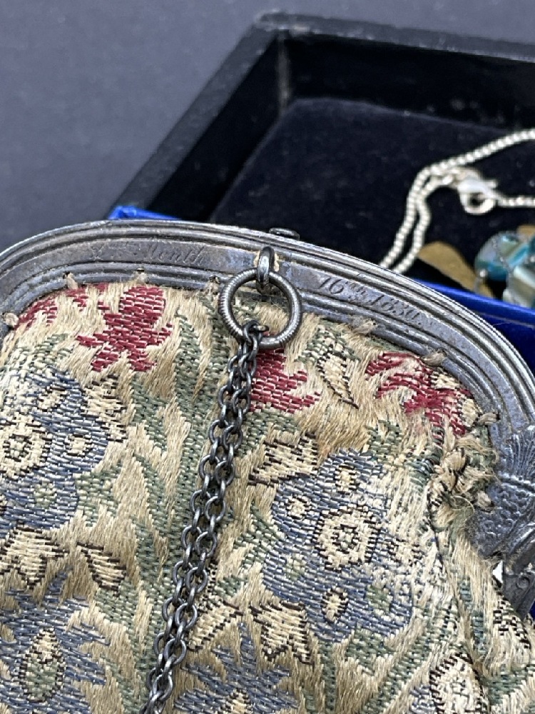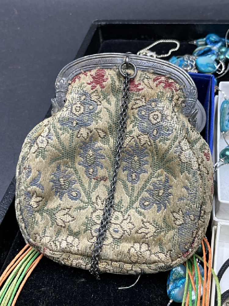 Estate Compiled Costume Jewelry Group and c. 1830 Needlepoint and Silver Change Purse.