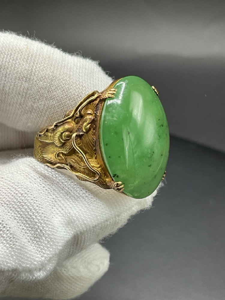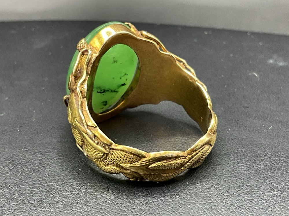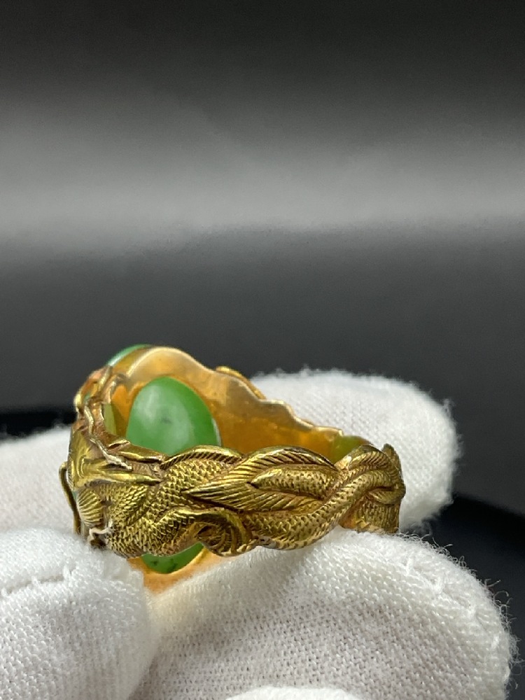 Vintage 14K Yellow Gold Men’s Jade Dragon Ring. Highly ornate design with full bodied dragons formed in band.