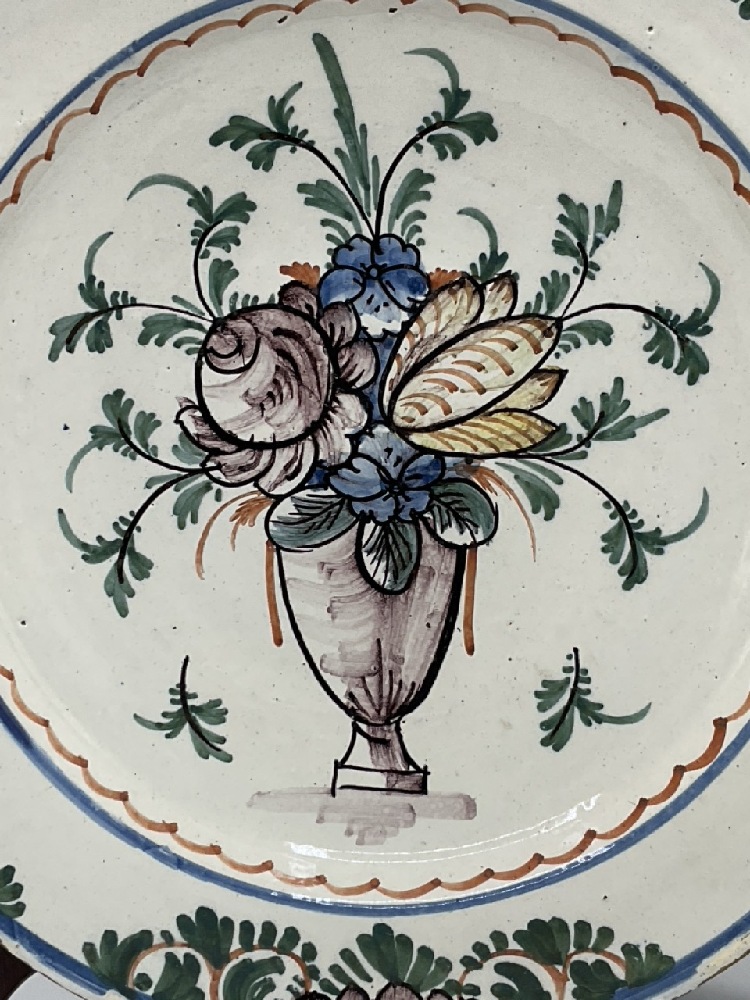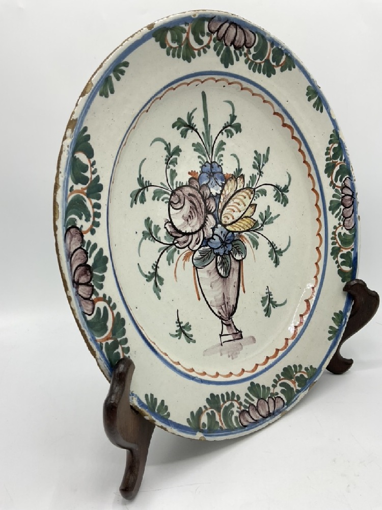 18th Century Polychrome Painted Dutch Charger. C. 1750. Multi-colored flowers in urn. Dimensions: 13 3/4”
