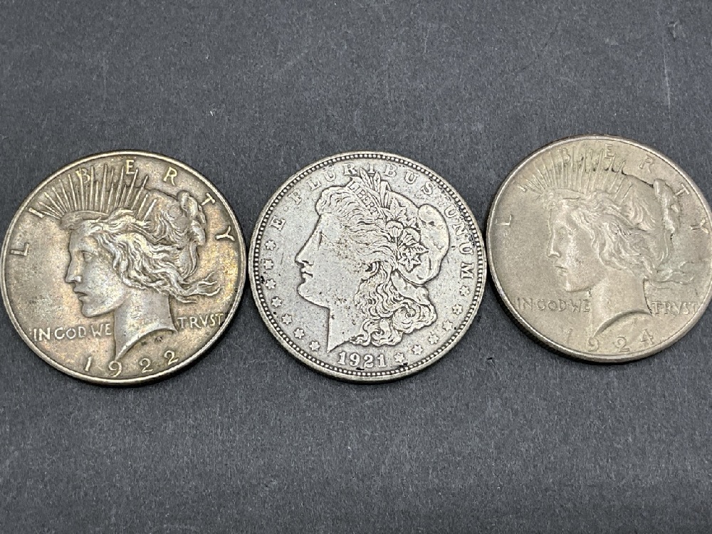 Three (3) U.S. Silver Dollars. Two (2) Peace and One Morgan.