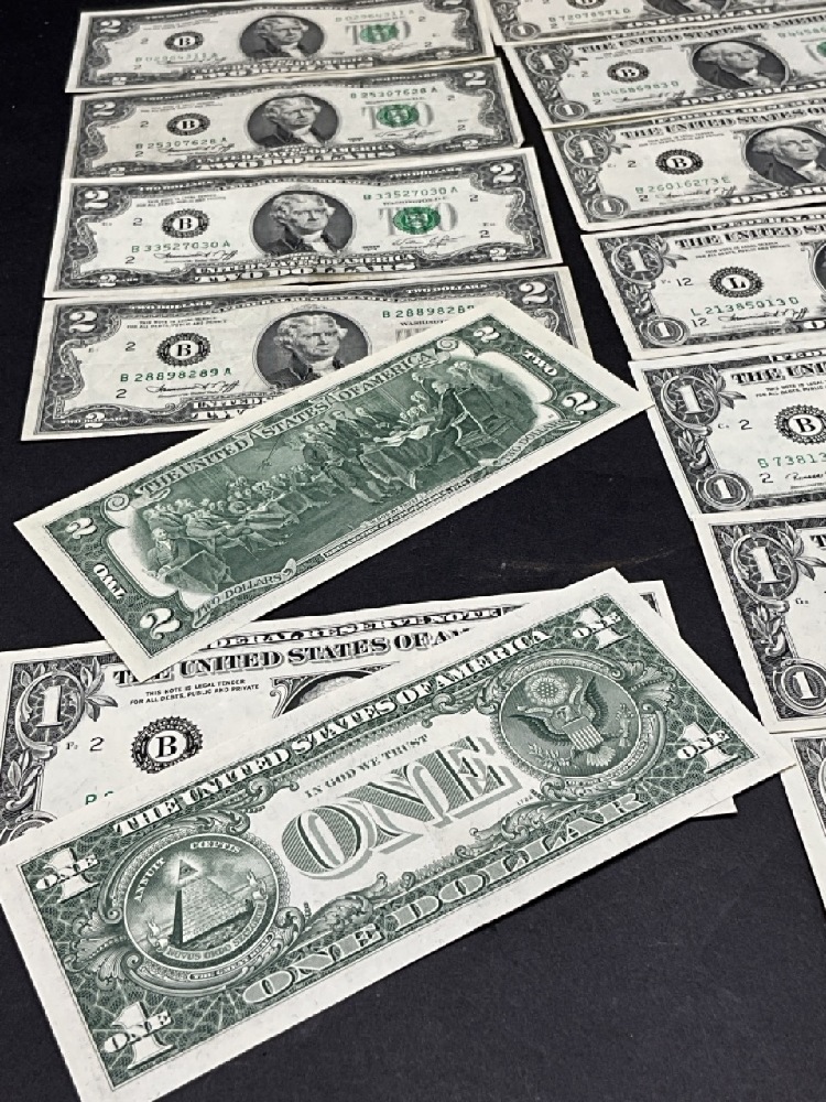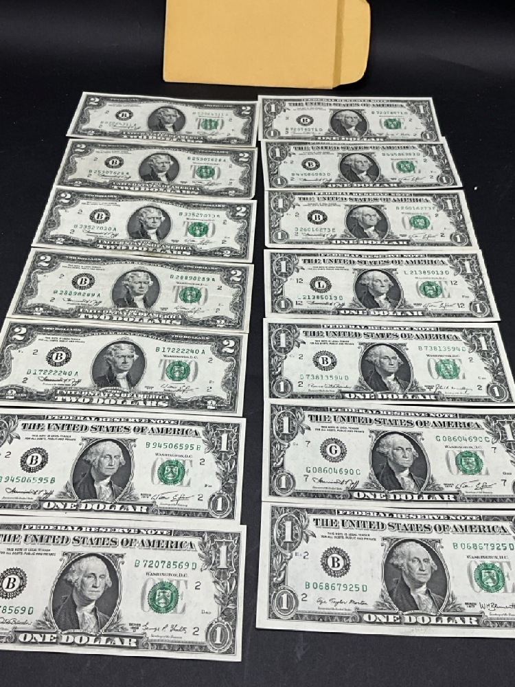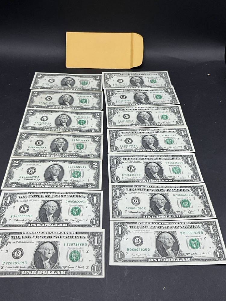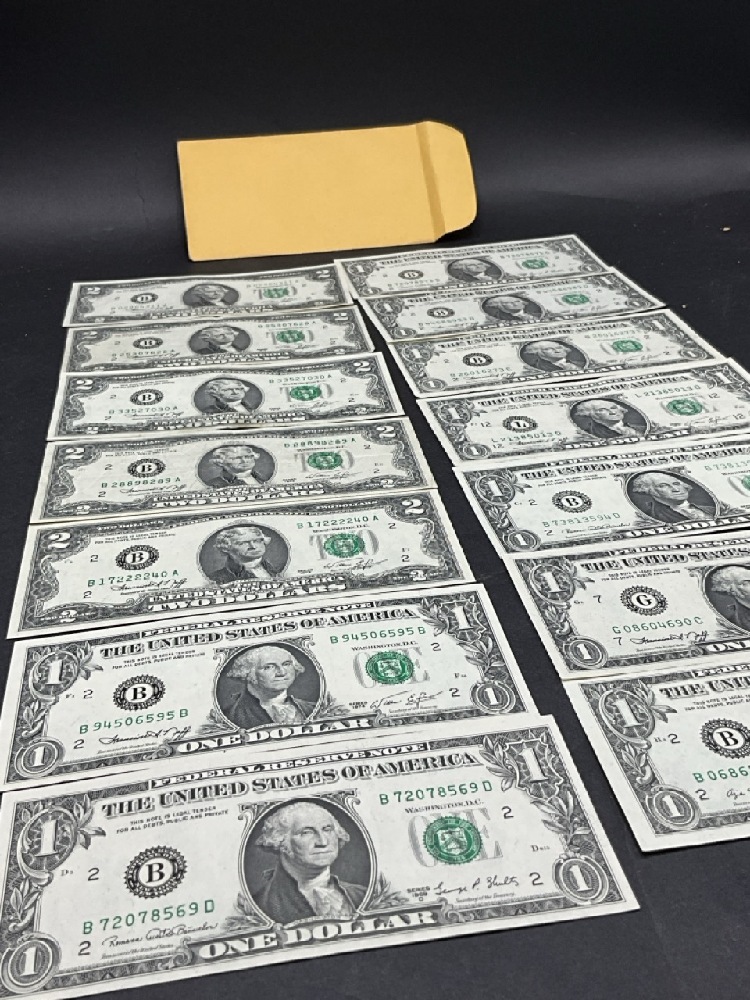 $19 Face (5) $2 and Nine (9) $1 U.S. Bank Notes.