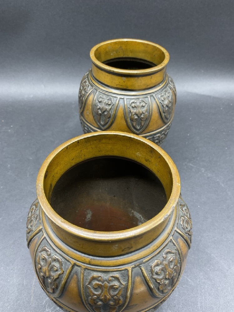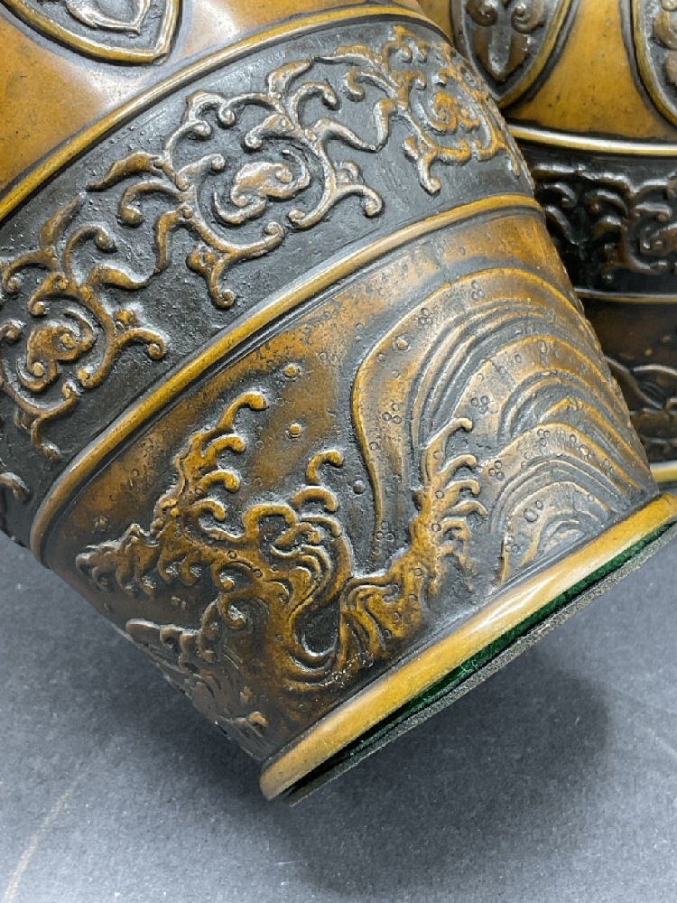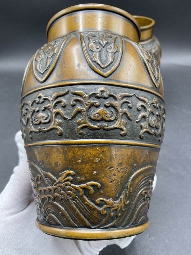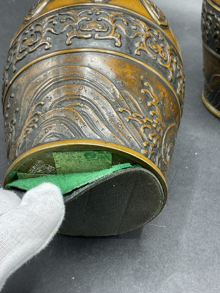 Early 20th Century Chinese Bronze Pair of Vases. Excellent patina. Felt covering to base. Unknown if signed. Please see photograph preview. Ocean sprays pattern with geometric designs.