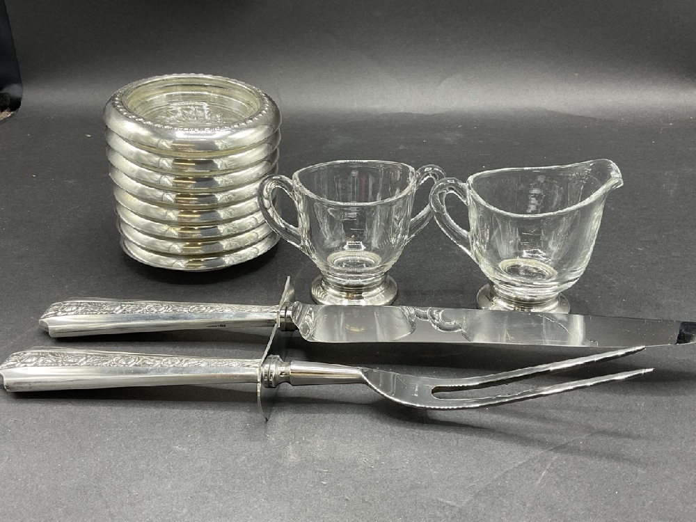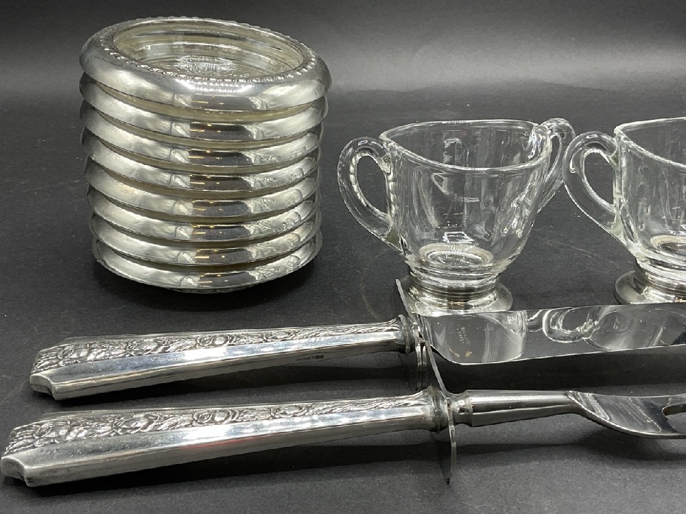 Compiled Grouping of Weighted Sterling Silver Tablewares. Sugar and creamer, coasters and carving set. As seen in photograph preview.