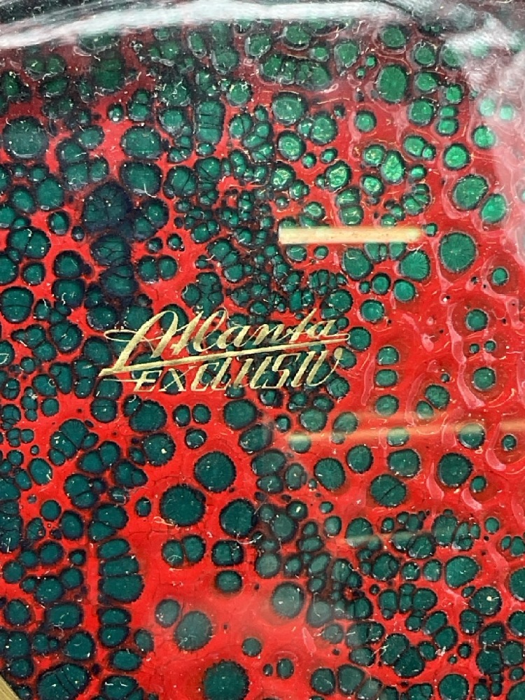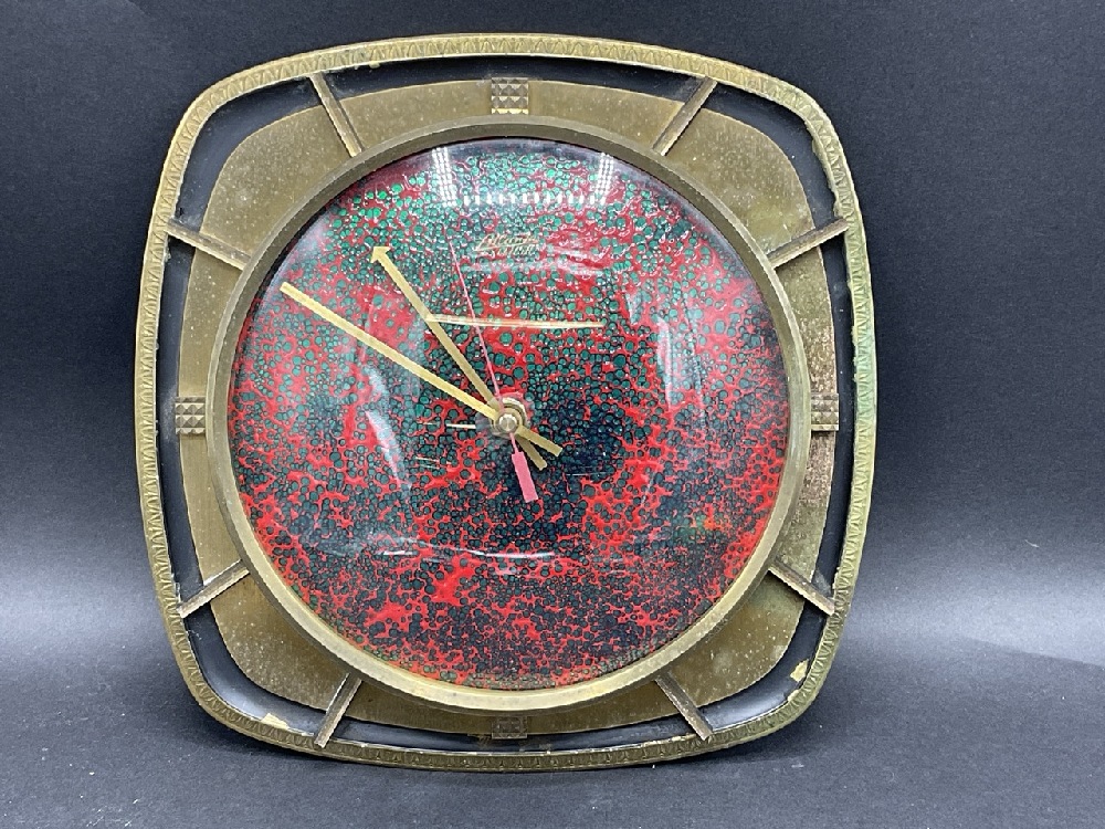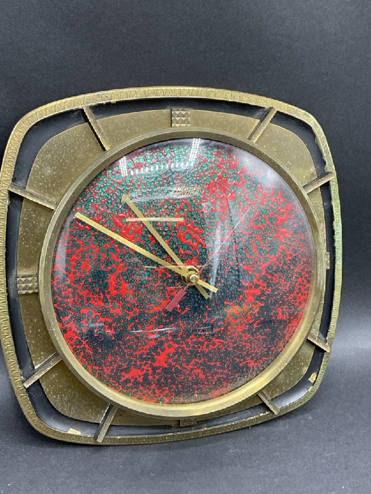 Atlanta Exclusive Enameled Mid Century Wall Clock.Having a lava enameled face with red and green colors and brass frame. German Kienzle battery operated clock operation.