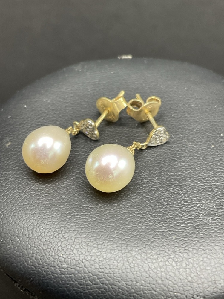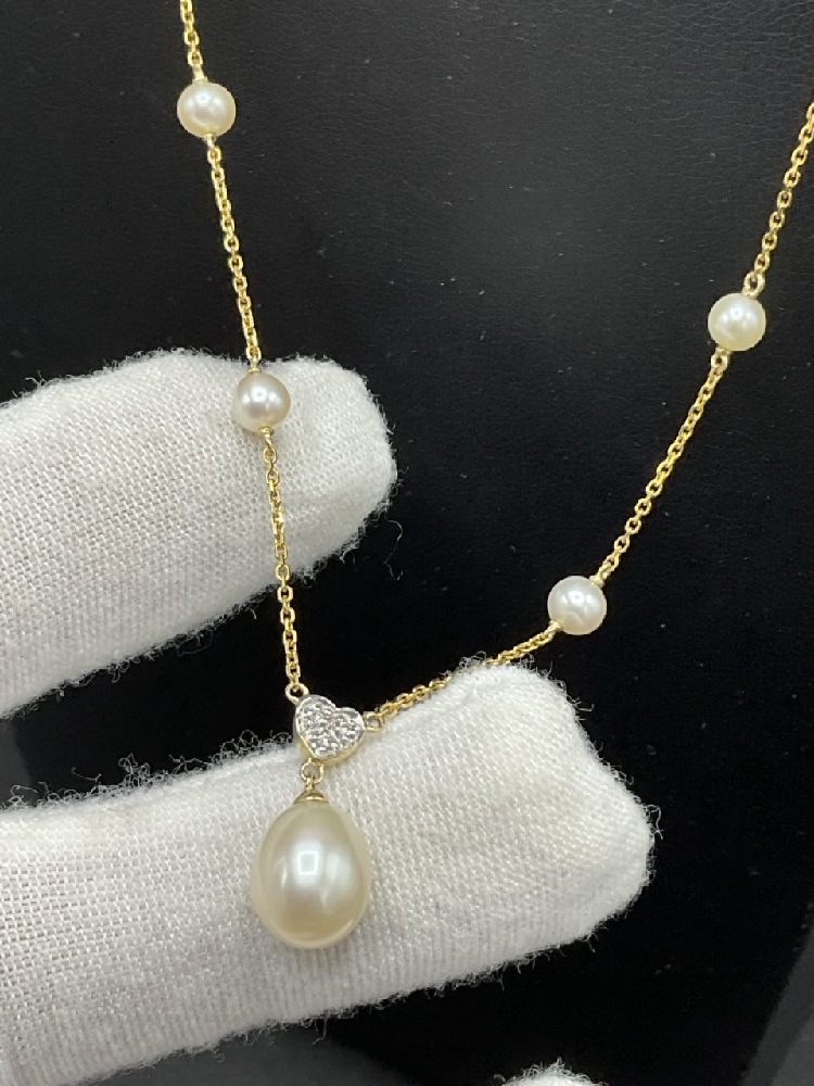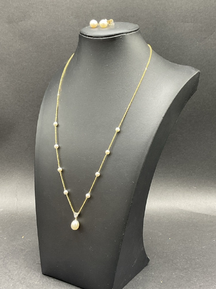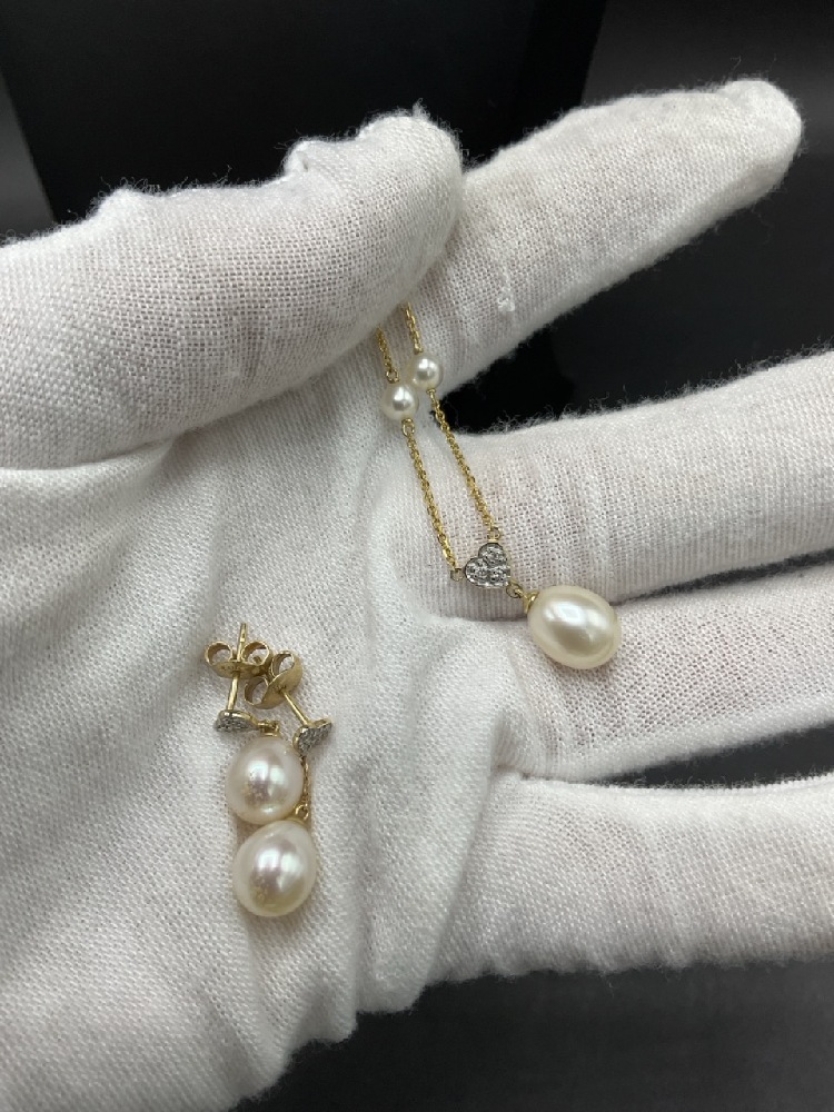 .14K Diamond and Pearl Necklace and Earrings Set