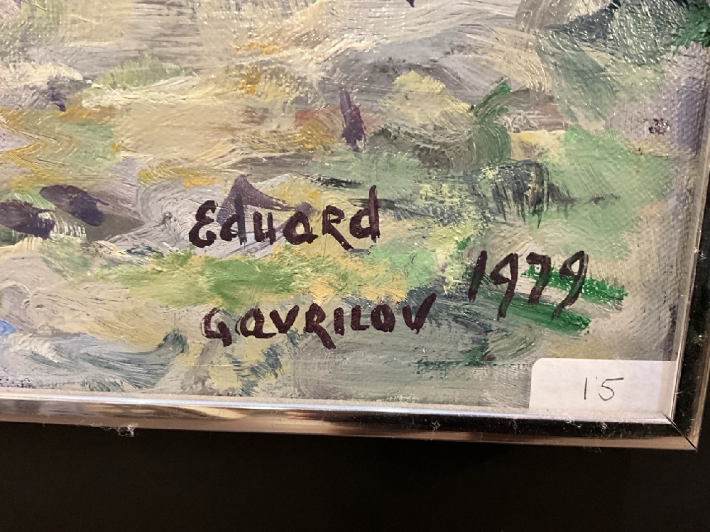 Bio: Eddik Gavrilov was born in a small town near the Siberian city of Vladivostok. After the usual schooling his interest turned to art and painting. A talented youn man, he was accepted at the L'Academie du Arts in Leningrad. Later when he graduated from the Academy in 1962 he continued his studies at the Repin Academy of Arts.