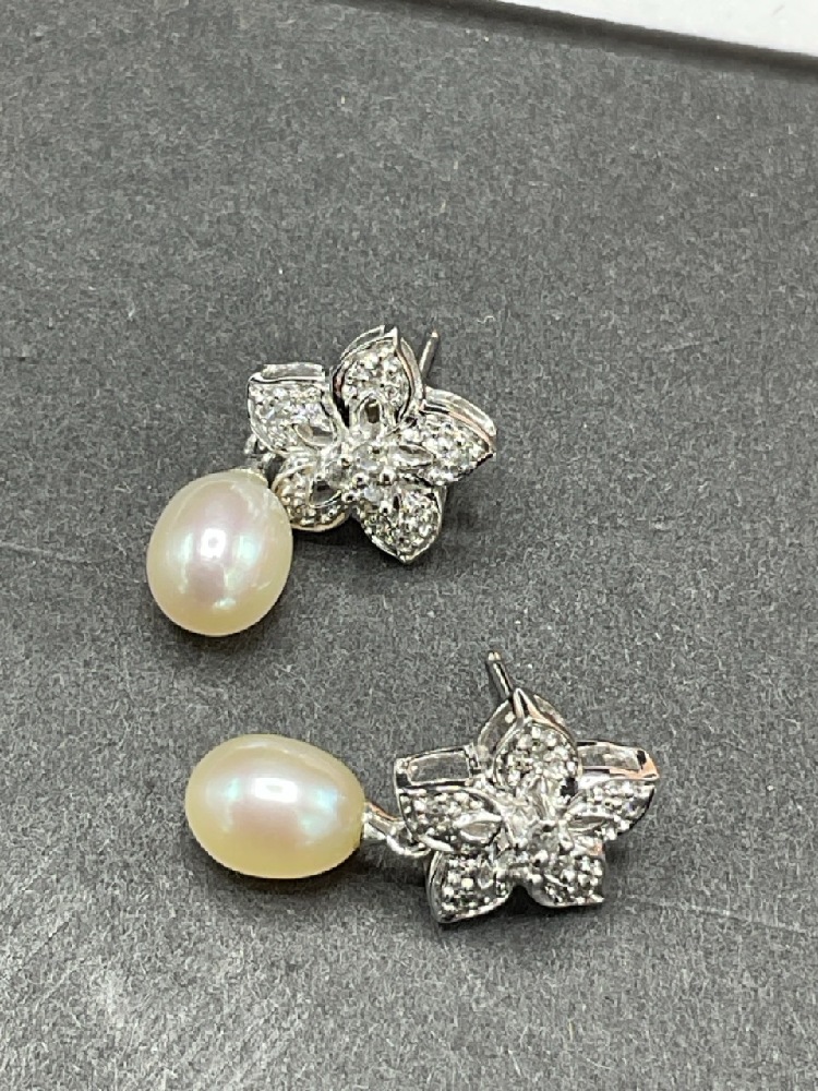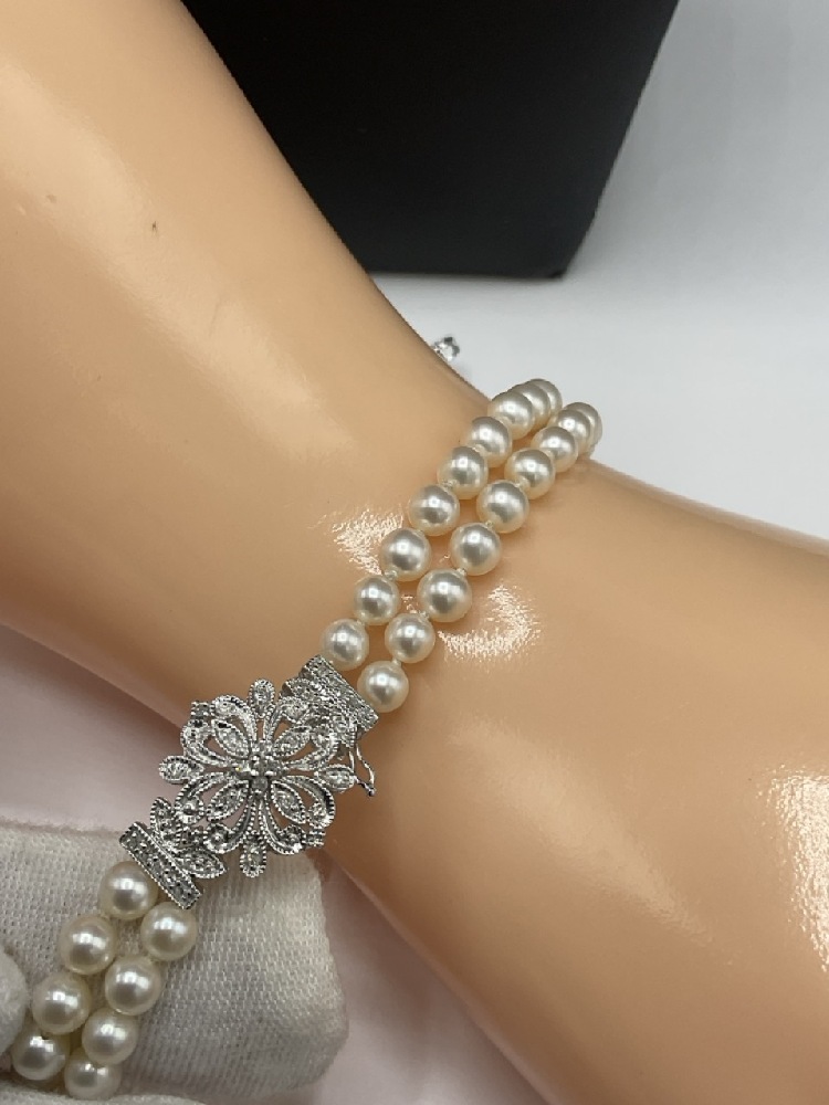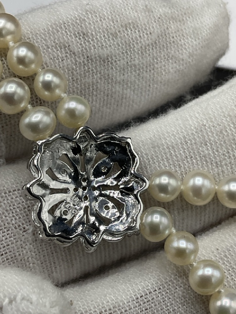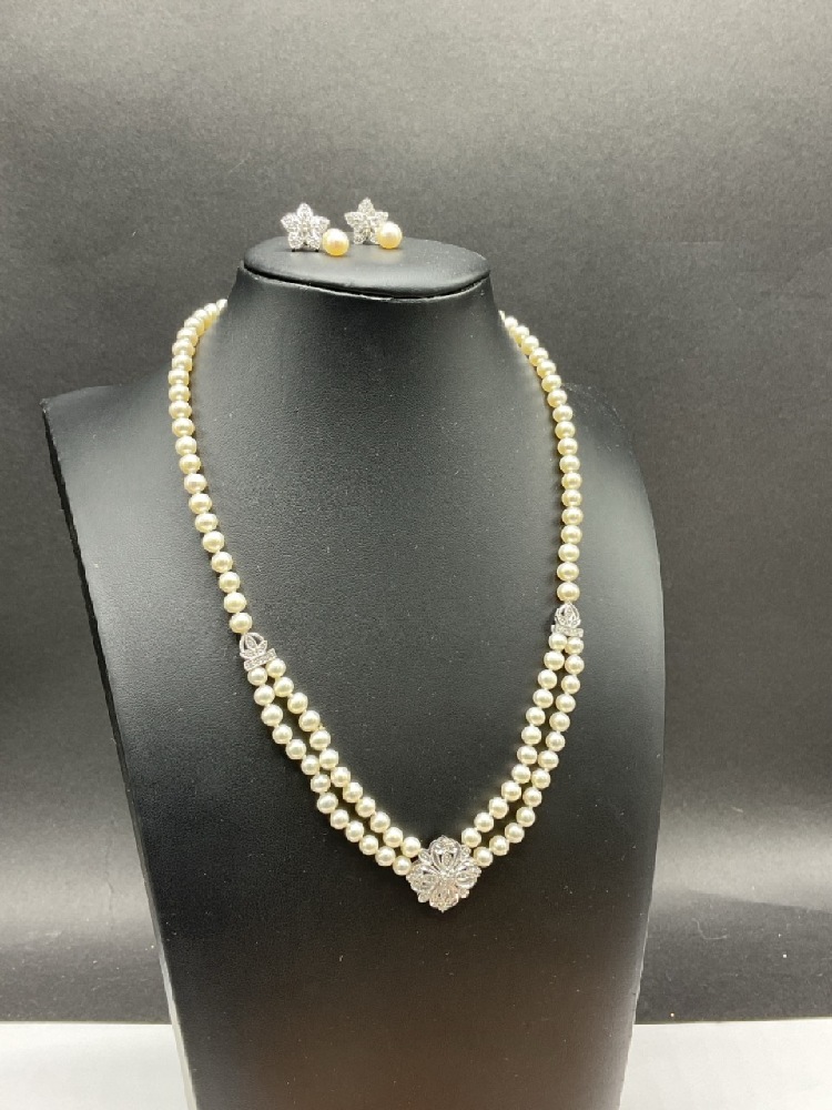 10K White Gold Pearl Set. Necklace, Bracelet and Earrings. All having matching diamond encrusted hearts.
