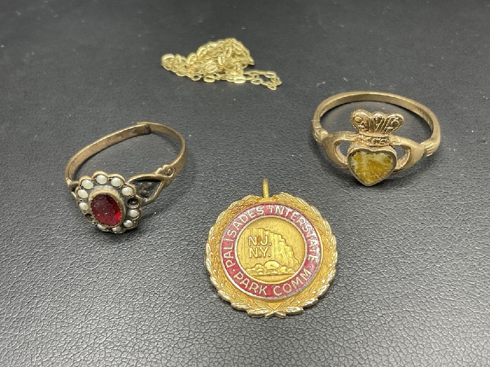 Estate Compiled 9ct and 10K Yellow Gold Jewelry. Pendant, Chain and Rings as seen in photograph preview.