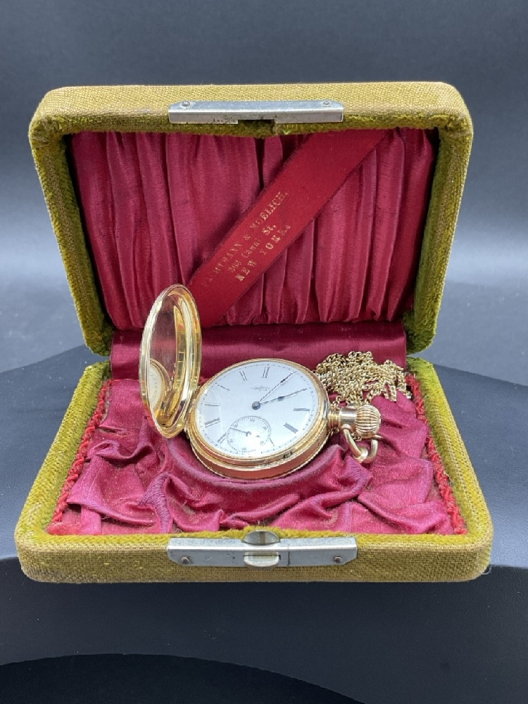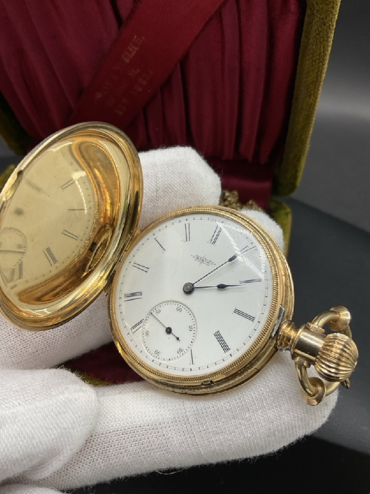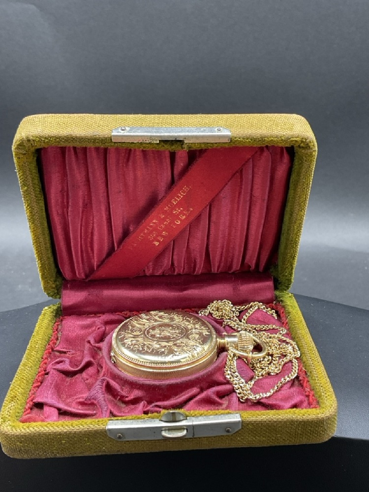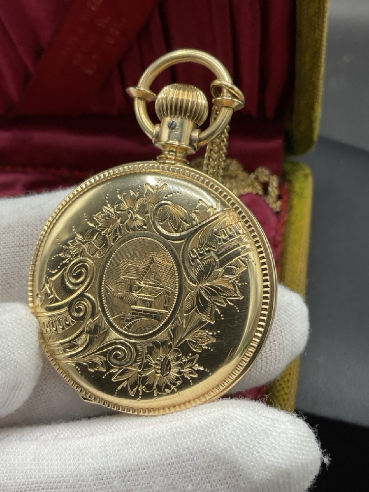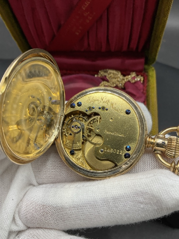 Estate Found 14K Yellow Gold Elgin Pocket Watch. Comes with a goldfilled chain. Very clean watch with minimal wear. Working order. Original box included.