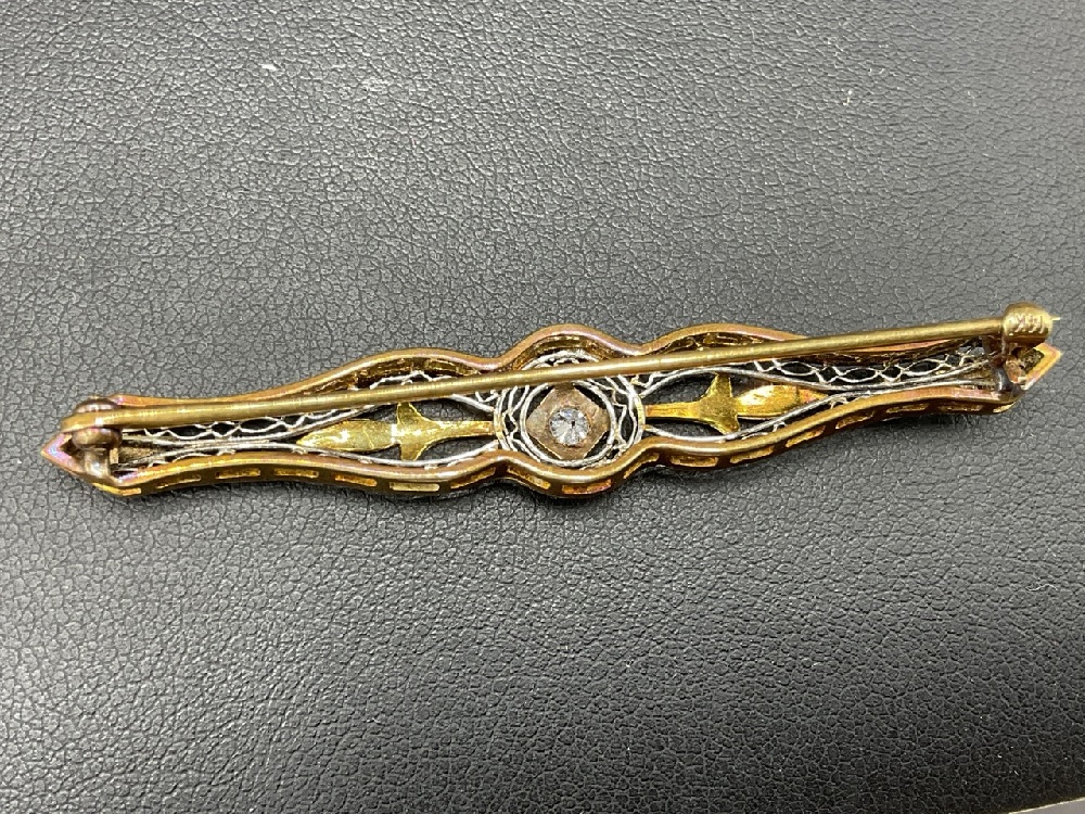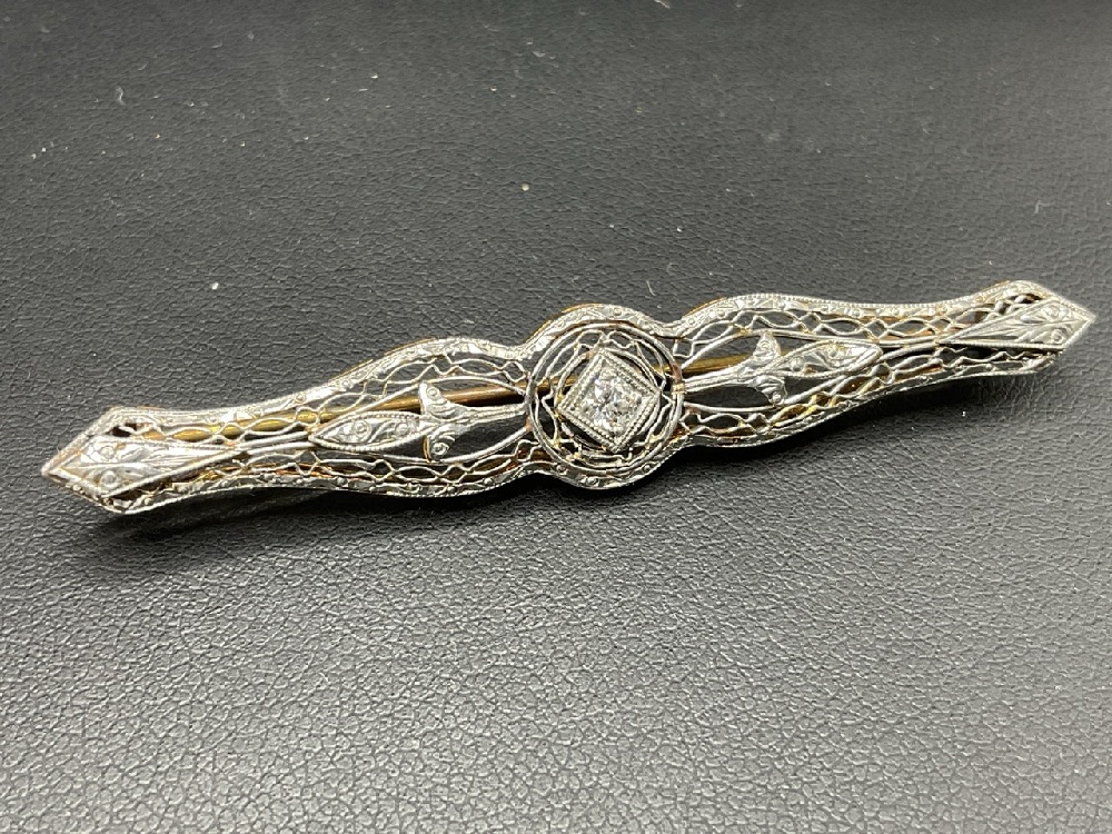 14K White and Yellow Gold Diamond Bar Pin. Fine filigree design with center large round diamond.