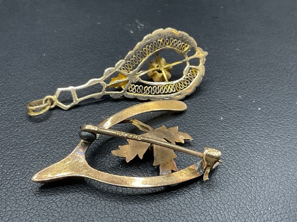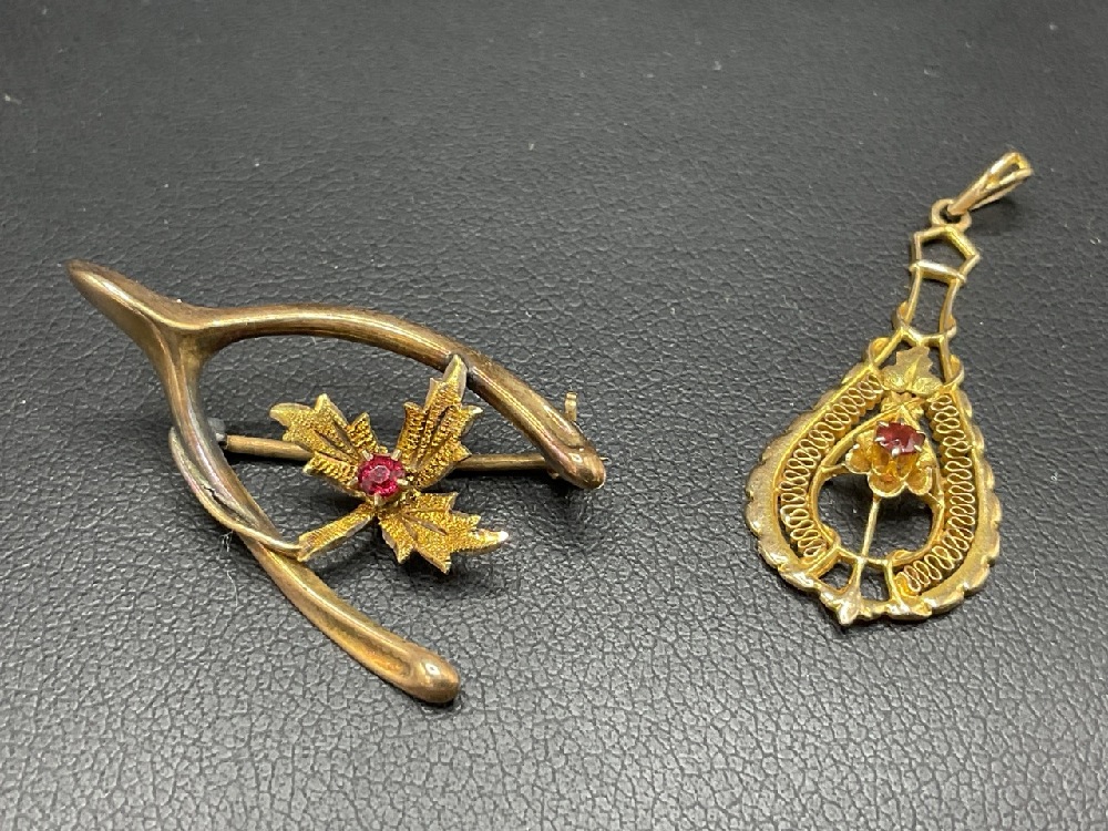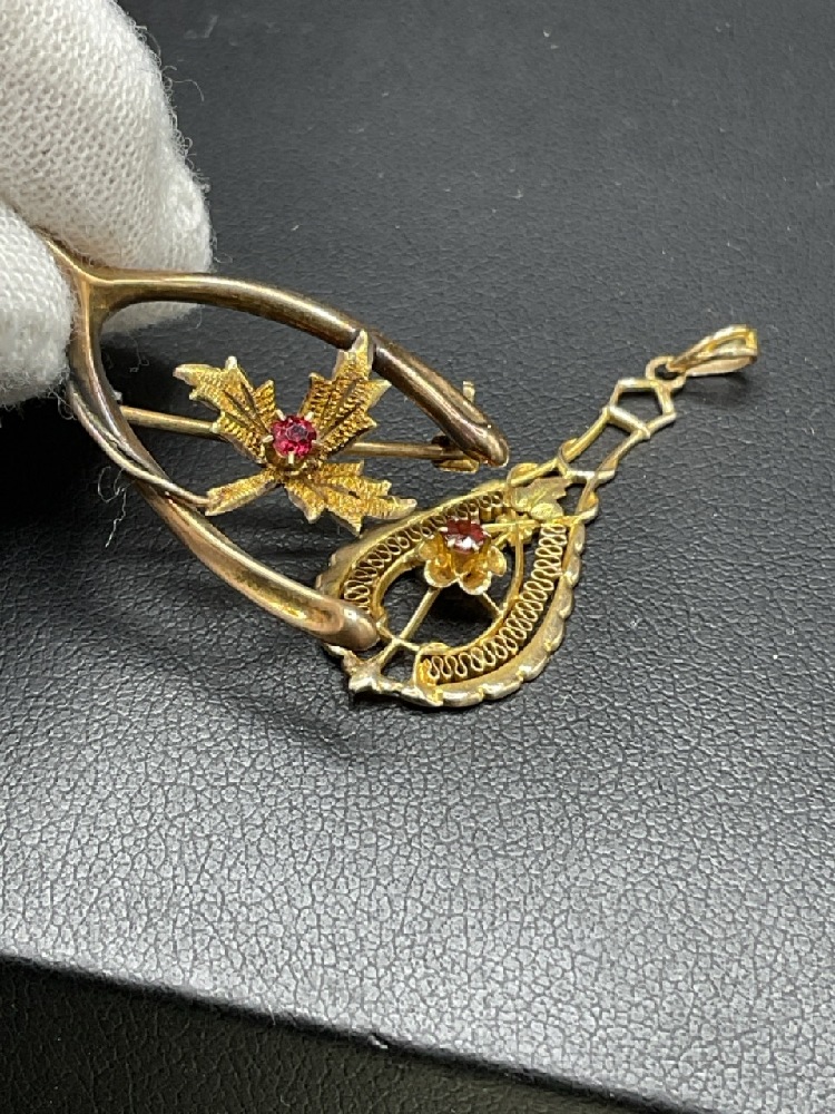 Two (2) 10K Yellow Gold Vintage Wishbone Pin and Drop Pendant with Garnet.