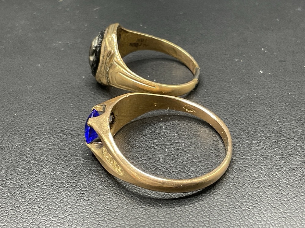 Two (2) 10K Yellow Gold Rings w/ Balfour Class Ring. Second ring with blue stone is damaged.